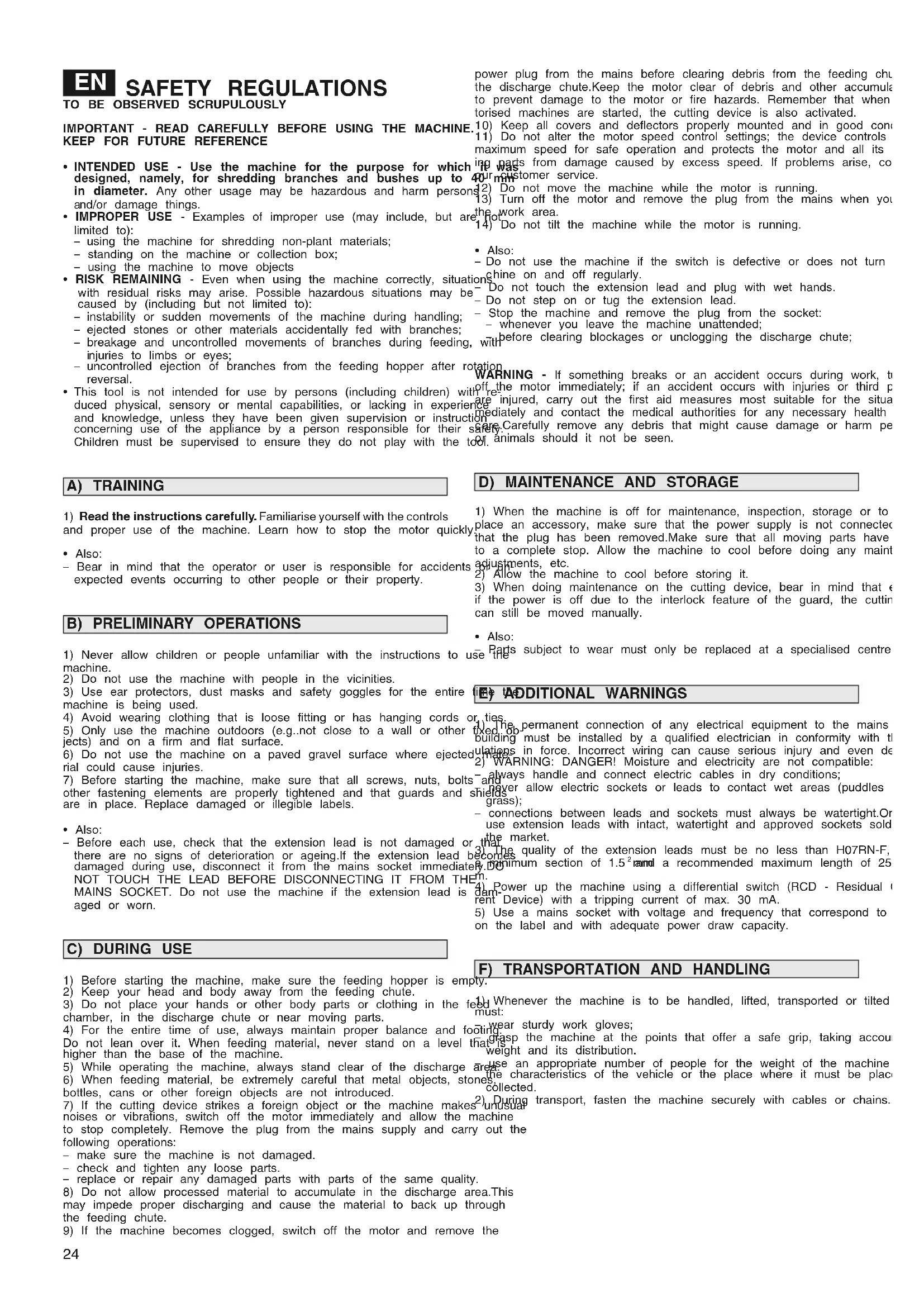 INTENDED USE - Use the machine for the purpose for which it was designed, namely, for shredding branches and bushes up to 40 mm