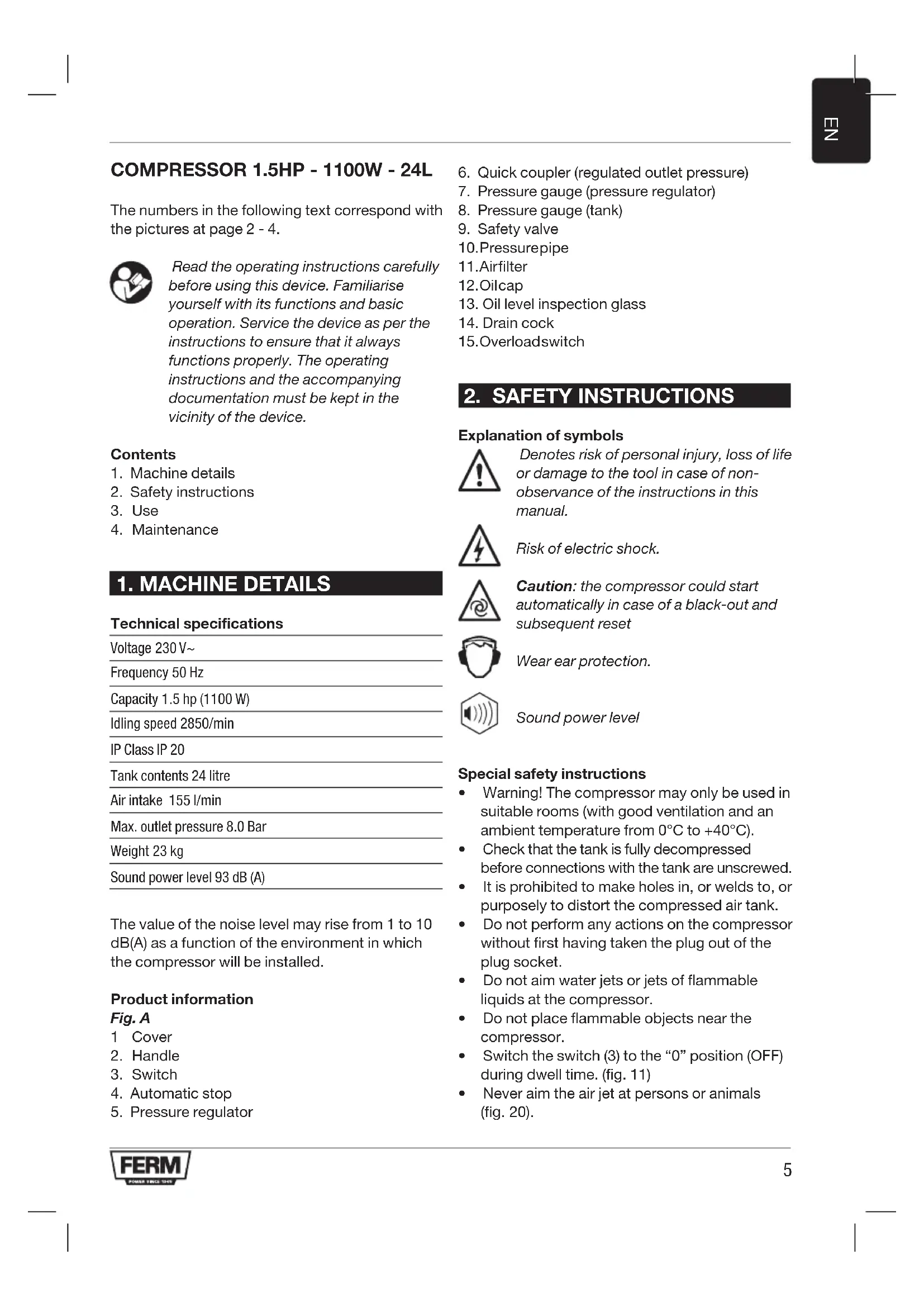 Technical specifications Voltage 230 V~ Frequency 50 Hz Capacity 1.5 hp (1100 W) Idling speed 2850/min IP Class IP 20 Tank contents 24 litre Air intake 155 l/min Max. outlet pressure 8.0 Bar Weight 23 kg Sound power level 93 dB (A) The value of the noise level may rise from 1 to 10 dB(A) as a function of the environment in which the compressor will be installed. Product information Fig. A 1 Cover