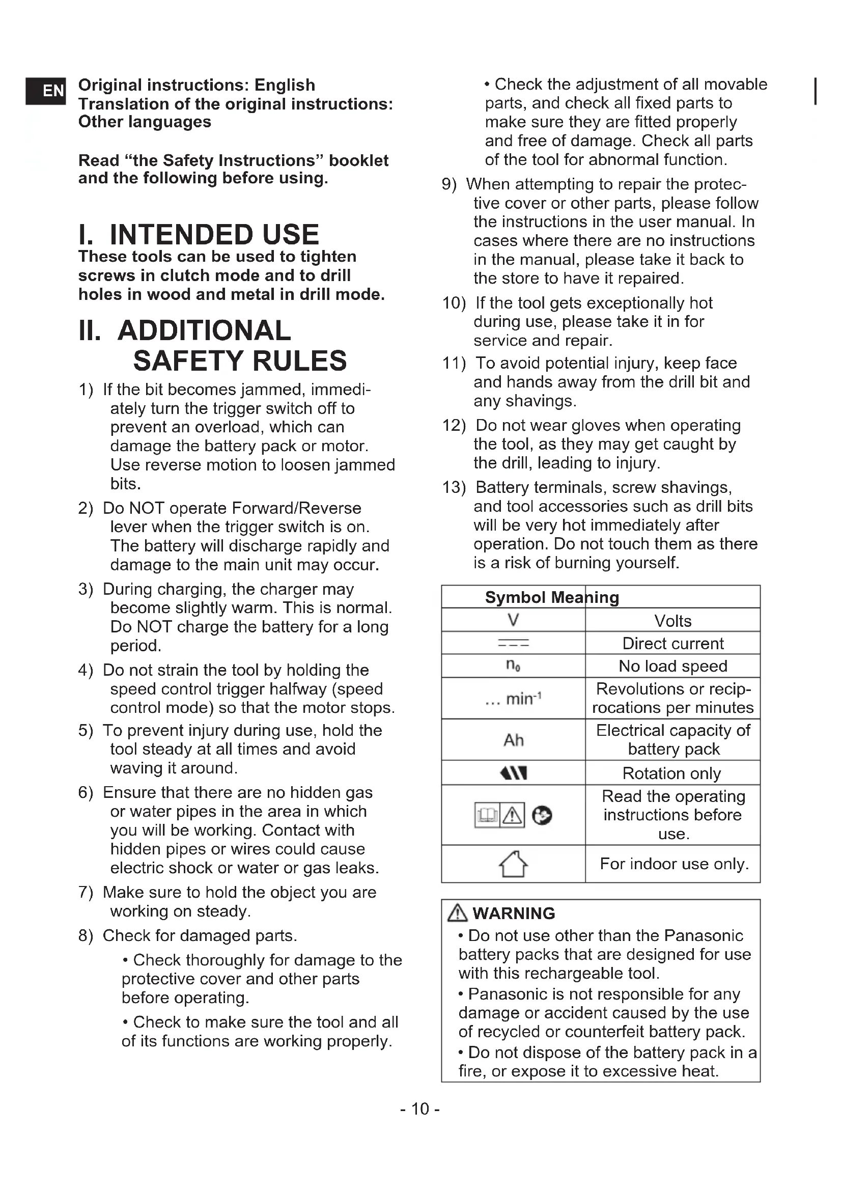 - Do not use other than the Panasonic battery packs that are designed for use with this rechargeable tool.