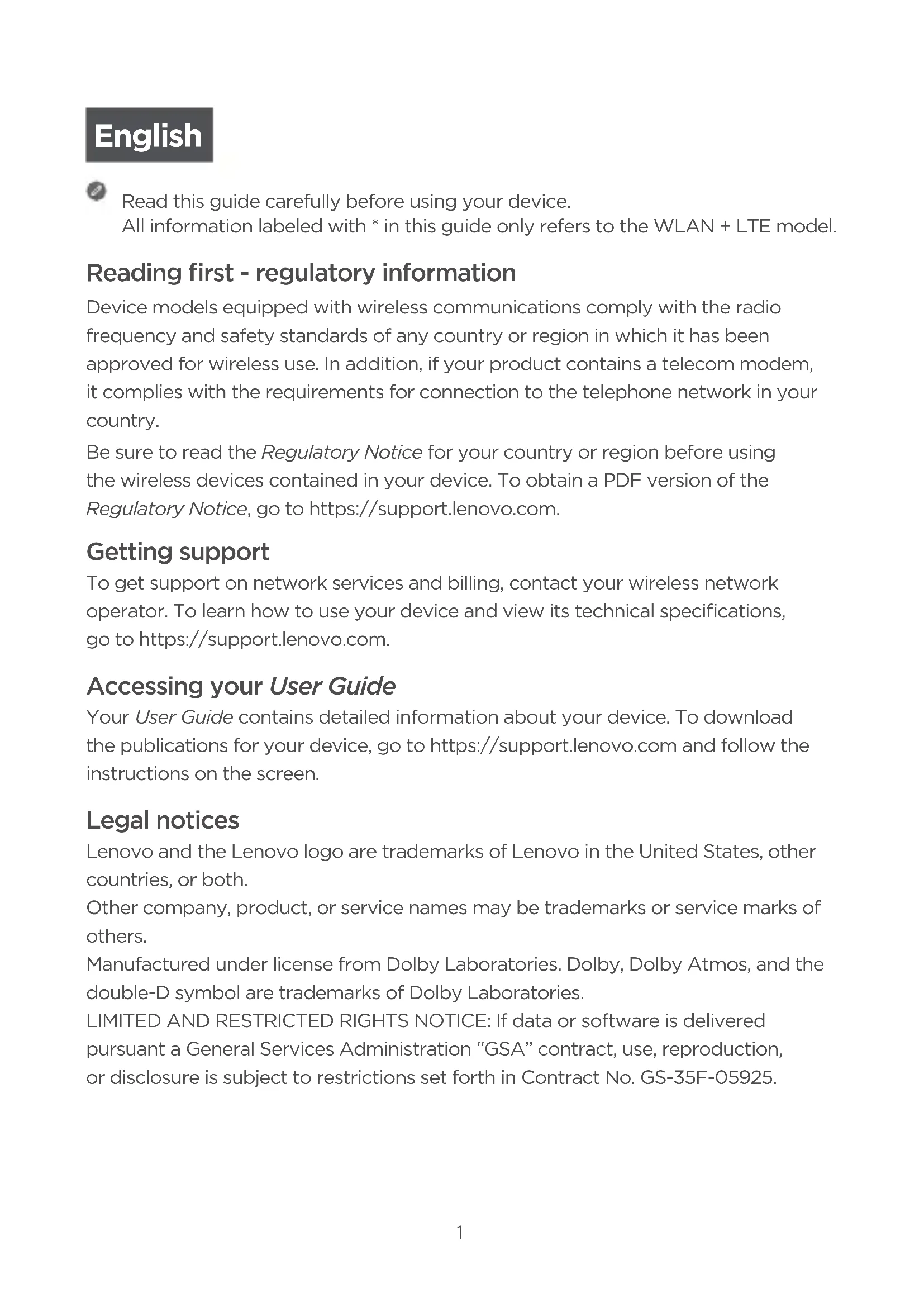 Reading first - regulatory information Device models equipped with wireless communications comply with the radio frequency and safety standards of any country or region in which it has been approved for wireless use. In addition, if your product contains a telecom modem, it complies with the requirements for connection to the telephone network in your country. Be sure to read the Regulatory Notice for your country or region before using the wireless devices contained in your device. To obtain a PDF version of the Regulatory Notice, go to https://support.lenovo.com. Getting support To get support on network services and billing, contact your wireless network operator. To learn how to use your device and view its technical specifications, go to https://support.lenovo.com. Accessing your User Guide Your User Guide contains detailed information about your device. To download the publications for your device, go to https://support.lenovo.com and follow the instructions on the screen. Legal notices Lenovo and the Lenovo logo are trademarks of Lenovo in the United States, other countries, or both. Other company, product, or service names may be trademarks or service marks of others. Manufactured under license from Dolby Laboratories. Dolby, Dolby Atmos, and the double-D symbol are trademarks of Dolby Laboratories. LIMITED AND RESTRICTED RIGHTS NOTICE: If data or software is delivered pursuant a General Services Administration “GSA” contract, use, reproduction, or disclosure is subject to restrictions set forth in Contract No. GS-35F-05925. English2 Device overview Model Version Lenovo YT-X705F WLAN Lenovo YT-X705L LTE Lenovo YT-X705X LTE+Voice