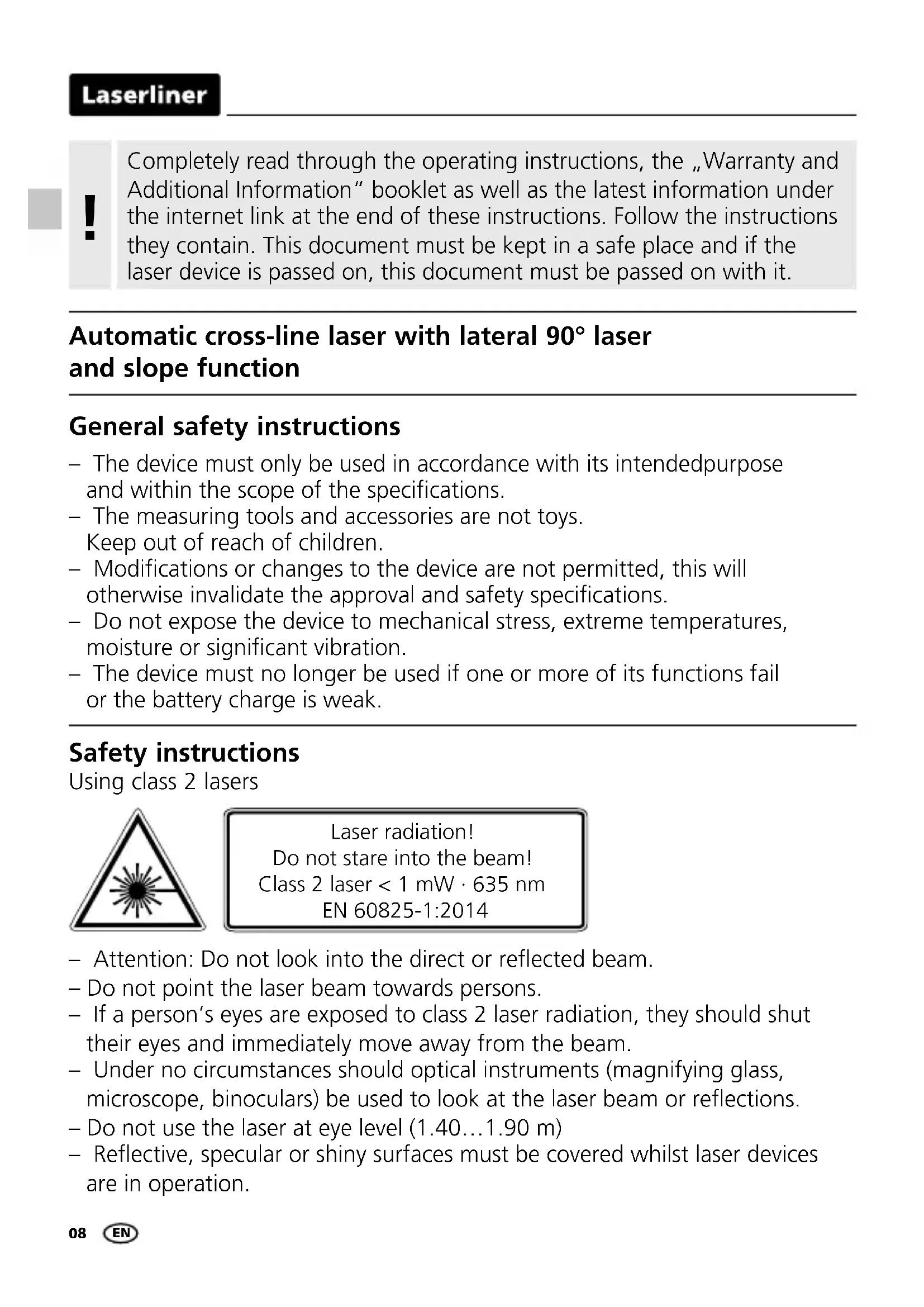 Technische Änderungen vorbehalten. 18W1008 Completely read through the operating instructions, the „Warranty and Additional Information“ booklet as well as the latest information under the internet link at the end of these instructions. Follow the instructions they contain. This document must be kept in a safe place and if the laser device is passed on, this document must be passed on with it.