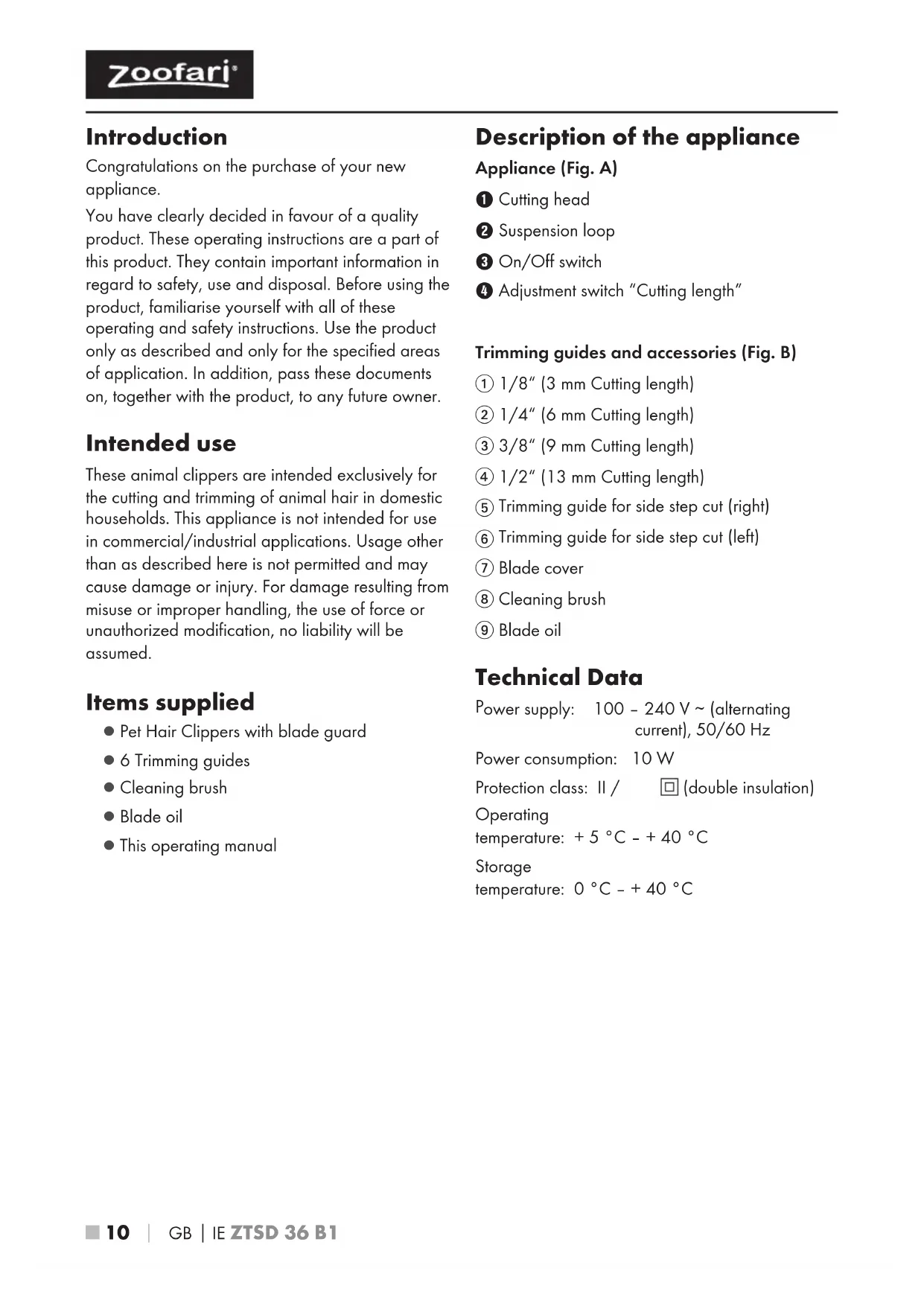 Introduction Congratulations on the purchase of your new appliance. You have clearly decided in favour of a quality product. These operating instructions are a part of this product. They contain important information in regard to safety, use and disposal. Before using the product, familiarise yourself with all of these operating and safety instructions. Use the product only as described and only for the specified areas of application. In addition, pass these documents on, together with the product, to any future owner. Intended use These animal clippers are intended exclusively for the cutting and trimming of animal hair in domestic households. This appliance is not intended for use in commercial/industrial applications. Usage other than as described here is not permitted and may cause damage or injury. For damage resulting from misuse or improper handling, the use of force or unauthorized modification, no liability will be assumed. Items supplied ▯ Pet Hair Clippers with blade guard ▯ 6 Trimming guides ▯ Cleaning brush ▯ Blade oil ▯ This operating manual Description of the appliance Appliance (Fig. A) 1 Cutting head 2 Suspension loop 3 On/Off switch 4 Adjustment switch “Cutting length” Trimming guides and accessories (Fig. B)