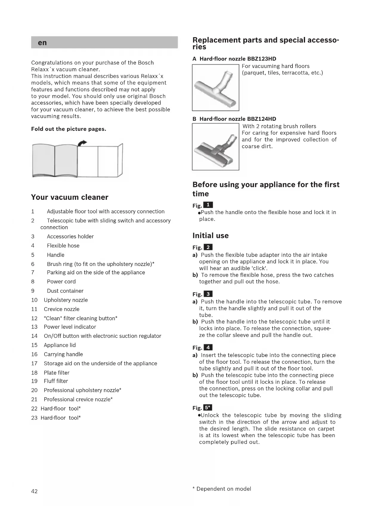 Congratulations on your purchase of the Bosch Relaxx´x vacuum cleaner. This instruction manual describes various Relaxx´x models, which means that some of the equipment features and functions described may not apply to your model. You should only use original Bosch accessories, which have been specially developed for your vacuum cleaner, to achieve the best possible vacuuming results. Fold out the picture pages. Your vacuum cleaner 1 Adjustable floor tool with accessory connection 2 Telescopic tube with sliding switch and accessory connection 3 Accessories holder 4 Flexible hose 5 Handle 6 Brush ring (to fit on the upholstery nozzle)* 7 Parking aid on the side of the appliance 8 Power cord 9 Dust container 10 Upholstery nozzle 11 Crevice nozzle 12 "Clean" filter cleaning button* 13 Power level indicator 14 On/Off button with electronic suction regulator 15 Appliance lid 16 Carrying handle 17 Storage aid on the underside of the appliance 18 Plate filter 19 Fluff filter 20 Professional upholstery nozzle* 21 Professional crevice nozzle* 22 Hard-floor tool* 23 Hard-floor tool*