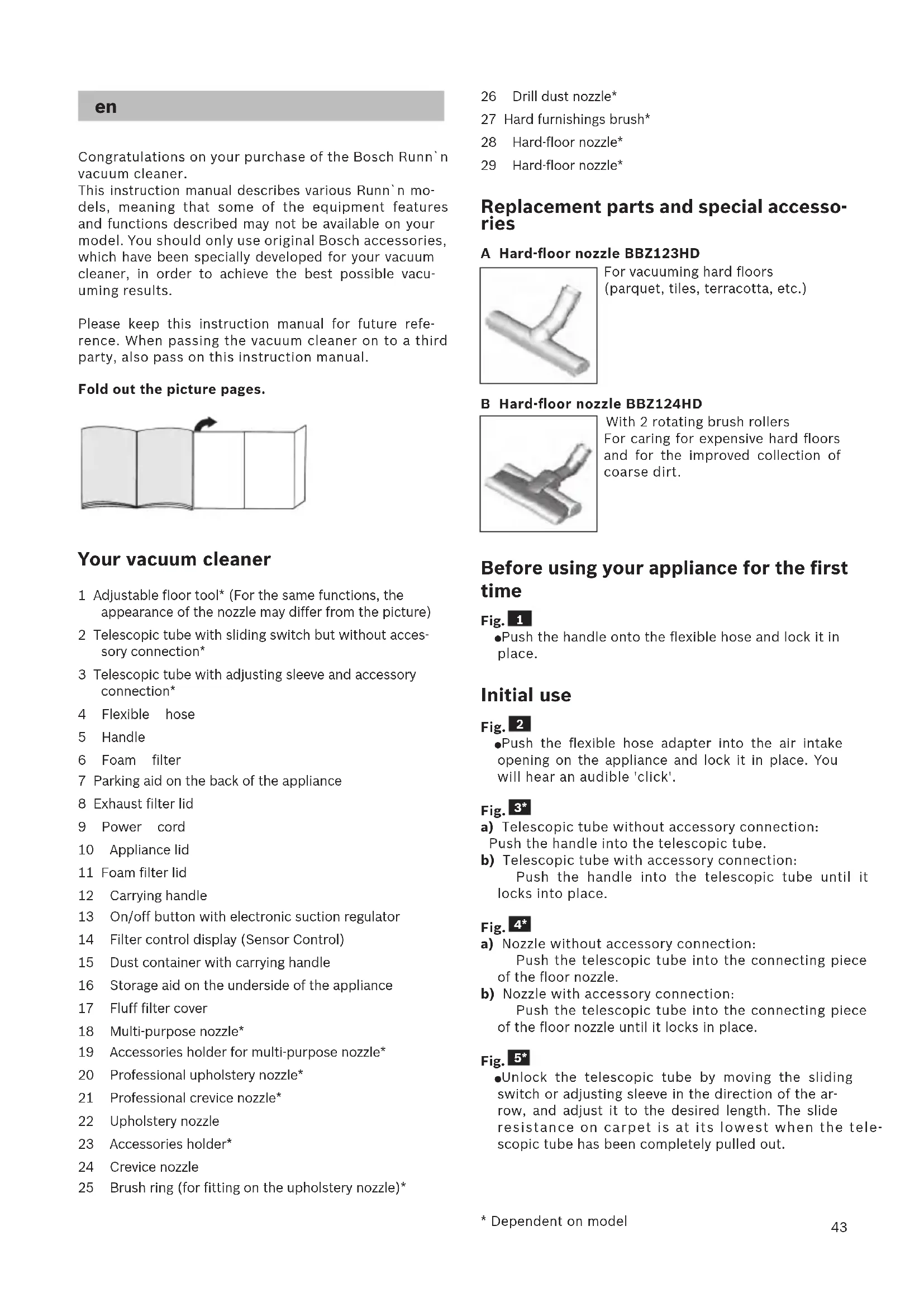 Congratulations on your purchase of the Bosch Runn`n vacuum cleaner. This instruction manual describes various Runn`n mo- dels, meaning that some of the equipment features and functions described may not be available on your model. You should only use original Bosch accessories, which have been specially developed for your vacuum cleaner, in order to achieve the best possible vacu- uming results. Please keep this instruction manual for future refe- rence. When passing the vacuum cleaner on to a third party, also pass on this instruction manual. Fold out the picture pages. Your vacuum cleaner 1 Adjustable floor tool* (For the same functions, the appearance of the nozzle may differ from the picture) 2 Telescopic tube with sliding switch but without acces- sory connection* 3 Telescopic tube with adjusting sleeve and accessory connection* 4 Flexible hose 5 Handle 6 Foam filter 7 Parking aid on the back of the appliance 8 Exhaust filter lid 9 Power cord 10 Appliance lid 11 Foam filter lid 12 Carrying handle 13 On/off button with electronic suction regulator 14 Filter control display (Sensor Control) 15 Dust container with carrying handle 16 Storage aid on the underside of the appliance 17 Fluff filter cover 18 Multi-purpose nozzle* 19 Accessories holder for multi-purpose nozzle* 20 Professional upholstery nozzle* 21 Professional crevice nozzle* 22 Upholstery nozzle 23 Accessories holder* 24 Crevice nozzle 25 Brush ring (for fitting on the upholstery nozzle)*
