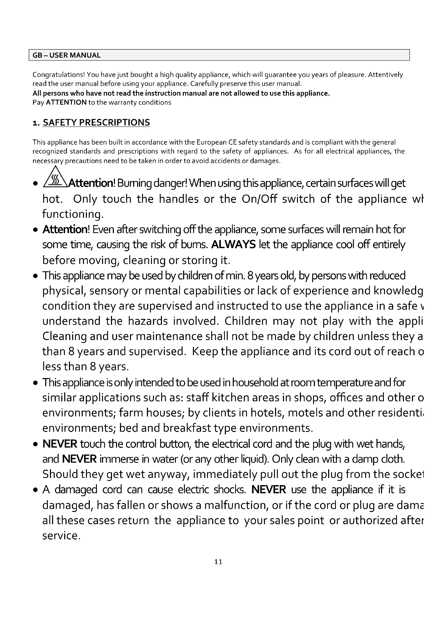 Congratulations! You have just bought a high quality appliance, which will guarantee you years of pleasure. Attentively read the user manual before using your appliance. Carefully preserve this user manual. All persons who have not read the instruction manual are not allowed to use this appliance. Pay ATTENTION to the warranty conditions