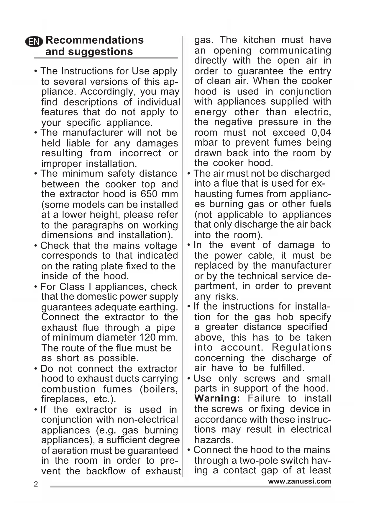 - Connect the hood to the mains through a two-pole switch hav- ing a contact gap of at least EN3 www.zanussi.com 3 mm. Use