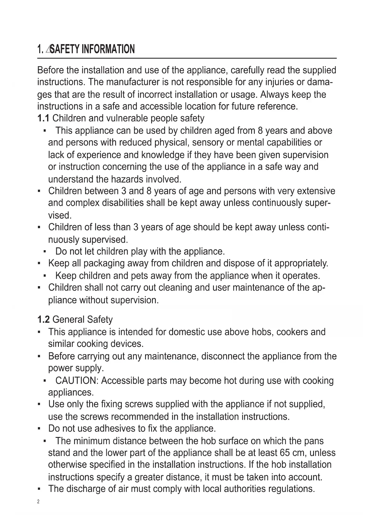 Before the installation and use of the appliance, carefully read the supplied instructions. The manufacturer is not responsible for any injuries or dama- ges that are the result of incorrect installation or usage. Always keep the instructions in a safe and accessible location for future reference.