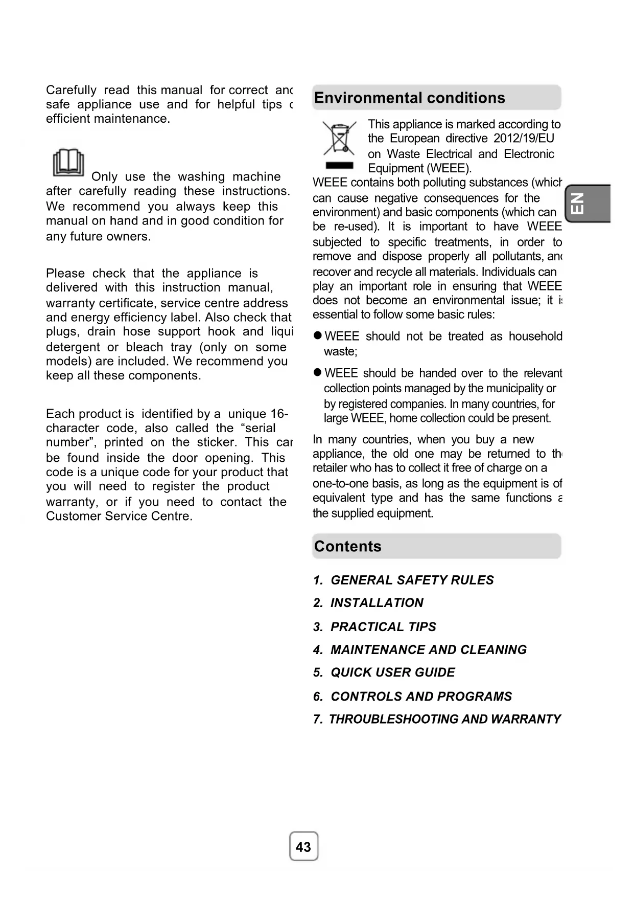 Carefully read this manual for correct and safe appliance use and for helpful tips on efficient maintenance. Only use the washing machine after carefully reading these instructions. We recommend you always keep this manual on hand and in good condition for any future owners. Please check that the appliance is delivered with this instruction manual, warranty certificate, service centre address and energy efficiency label. Also check that plugs, drain hose support hook and liquid detergent or bleach tray (only on some models) are included. We recommend you keep all these components. Each product is identified by a unique 16- character code, also called the “serial number”, printed on the sticker. This can be found inside the door opening. This code is a unique code for your product that you will need to register the product warranty, or if you need to contact the Customer Service Centre.
