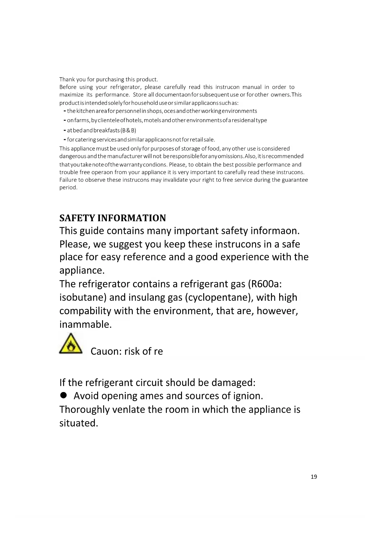 - TROUBLE SHOOTING Thank you for purchasing this product. Before using your refrigerator, please carefully read this instruction manual in order to maximize its performance. Store all documentation for subsequent use or for other owners. This product is intended solely for household use or similar applications such as: - the kitchen area for personnel in shops, offices and other working environments - on farms, by clientele of hotels, motels and other environments of a residential type - at bed and breakfasts (B & B) - for catering services and similar applications not for retail sale. This appliance must be used only for purposes of storage of food, any other use is considered dangerous and the manufacturer will not be responsible for any omissions. Also, it is recommended that you take note of the warranty conditions. Please, to obtain the best possible performance and trouble free operation from your appliance it is very important to carefully read these instructions. Failure to observe these instructions may invalidate your right to free service during the guarantee period. SAFETY INFORMATION This guide contains many important safety information. Please, we suggest you keep these instructions in a safe place for easy reference and a good experience with the appliance. The refrigerator contains a refrigerant gas (R600a: isobutane) and insulating gas (cyclopentane), with high compatibility with the environment, that are, however, inflammable. Caution: risk of fire If the refrigerant circuit should be damaged: Avoid opening flames and sources of ignition. Thoroughly ventilate the room in which the appliance is situated. Percentage running time: 18℃:Runing11min,stopping 20min20 WARNING! Care must be taken while cleaning/carrying the appliance to avoid touching the condenser metal wires at the back of the appliance, as you might injure your fingers and hands or damage your product. This appliance is not designed for stacking with any other appliance. Do not attempt to sit or stand on top of your appliance as it is not designed for such use. You could injure yourself or damage the appliance. Make sure that mains cable is not caught under the appliance during and after carrying/moving the appliance, to avoid the mains cable becoming cut or damaged. When positioning your appliance take care not to damage your flooring, pipes, wall coverings etc. Do not move the appliance by pulling by the lid or handle. Do not allow children to play with the appliance or tamper with the controls. Our company declines to accept any liability should the instructions not be followed. Do not install the appliance in humid, oily or dusty places, nor expose it to direct sunlight and to water. Do not install the appliance near heaters or inflammable materials. If there is a power failure do not open the lid. Frozen food should not be affected if the failure21 lasts for less than 20 hours. If the failure is longer, then the food should be checked and eaten immediately or cooked and then refrozen. If you find that the lid of the chest freezer is difficult to open just after you have closed it, don’t worry. This is due to the pressure difference which will equalize and allow the lid to be opened normally after a few minutes. Do not connect the appliance to the electricity supply until all packing and transit protectors have been removed. Leave to stand for at least 4 hours before switching on to allow compressor oil to settle if transported horizontally. This freezer must only be used for its intended purpose (i.e. storing and freezing of edible foodstuff). Do not store medicine or research materials in the Wine Coolers. When the material that requires a strict control of storage temperatures is to be stored, it is possible that it will deteriorate or an uncontrolled reaction may occur that can cause risks. Before performing any operation, unplug the power cord from the power socket. On delivery, check to make sure that the product is not damaged and that all the parts and accessories are in perfect condition. If in the refrigeration system a leak is noted, do not22 touch the wall outlet and do not use open flames. Open the window and let air into the room. Then call a service center to ask for repair. Do not use extension cords or adapters. Do not excessively pull or fold the power cord or touch the plug with wet hands. Do not damage the plug and/or the power cord; this could cause electrical shocks or fires. Do not place or store inflammable and highly volatile materials such as ether, petrol, LPG, propane gas, aerosol spray cans, adhesives, pure alcohol, etc. These materials may cause an explosion. Do not use or store inflammable sprays, such as spray paint, near the Wine Coolers. It could cause an explosion or fire. Do not place objects and/or containers filled with water on the top of the appliance. We do not recommend the use of extension leads and multi-way adapters. Do not dispose of the appliance on a fire. Take care not to damage, the cooling circuit/pipes of the appliance in transportation and in use. In case of damage do not expose the appliance to fire, potential ignition source and immediately ventilate the room where the appliance is situated. The refrigeration system positioned behind and inside the Wine Coolers contains refrigerant. Therefore, avoid damaging the tubes.23 Do not use electrical appliances inside the food storage compartments of the appliance, unless they are of the type recommended by the manufacturer. Do not damage the refrigerant circuit. Do not use mechanical devices or other means to accelerate the defrosting process, other than those recommended by the manufacturer. Do not use electrical appliances inside the food storage compartments, unless they are of the type recommended by the manufacturer. Maintain the ventilation openings in the appliance enclosure or in the built-in structure, free of obstruction. Do not use pointed or sharp-edged objects such as knives or forks to remo
