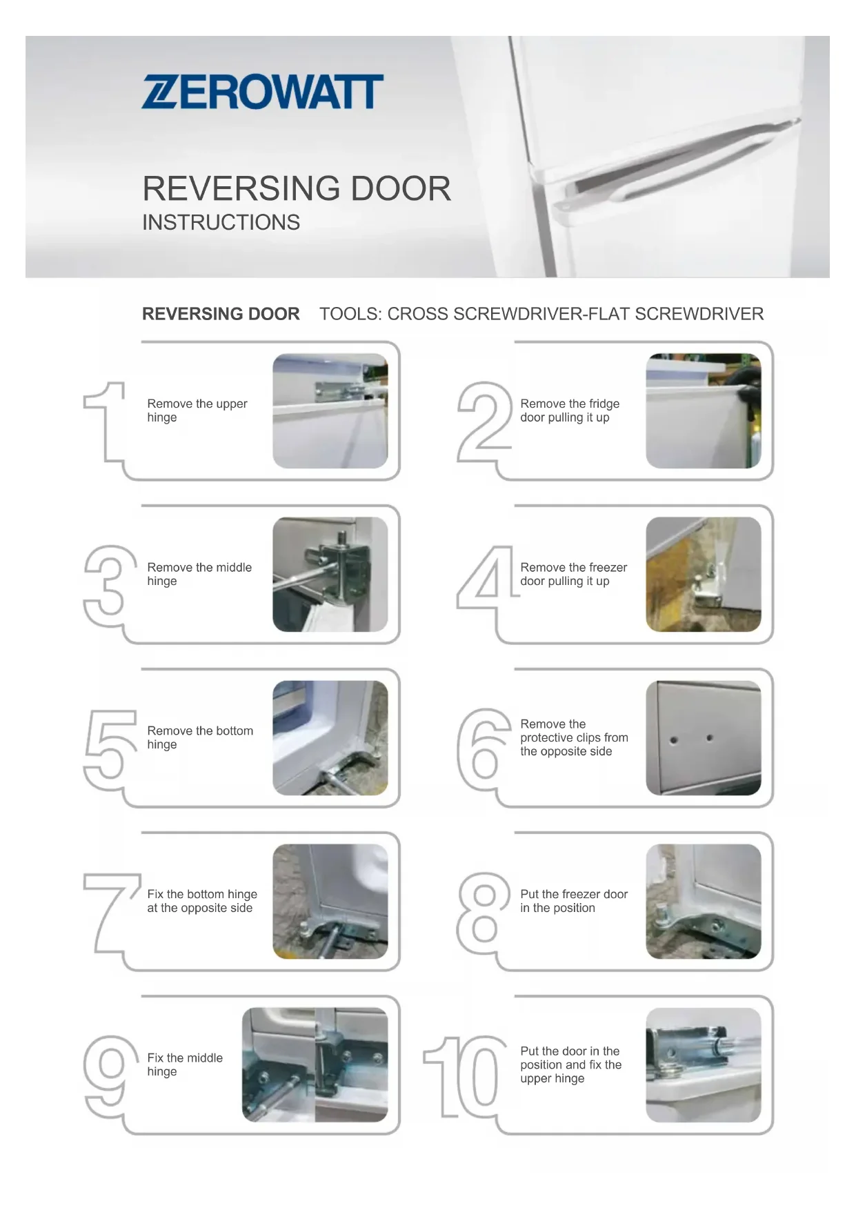 INSTRUCTIONS Open the door From the corner pull the gasket outside of position Remove the gasket from the whole door frame Fit the new gasket pushing it on the frameREVERSING DOOR TOOLS: CROSS SCREWDRIVER-FLAT SCREWDRIVER REVERSING DOOR INSTRUCTIONS Remove the upper hinge Remove the fridge door pulling it up Remove the middle hinge Remove the freezer door pulling it up Remove the bottom hinge Remove the protective clips from the opposite side Put the freezer door in the position Fix the middle hinge Put the door in the position and x the upper hinge Fix the bottom hinge at the opposite sideDRAWER INTERNAL ACCESSORIES INSTRUCTIONS Open the door Pull the drawer outside SHELF Open the door Pull the shelf Remove the shelf keeping it slightly inclined