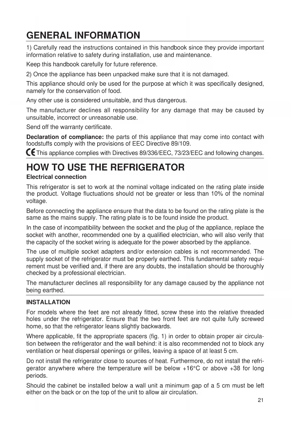 This appliance should only be used for the purpose at which it was specifically designed, namely for the conservation of food. Any other use is considered unsuitable, and thus dangerous. The manufacturer declines all responsibility for any damage that may be caused by unsuitable, incorrect or unreasonable use. Send off the warranty certificate. Declaration of compliance: the parts of this appliance that may come into contact with foodstuffs comply with the provisions of EEC Directive 89/109. This appliance complies with Directives 89/336/EEC, 73/23/EEC and following changes.