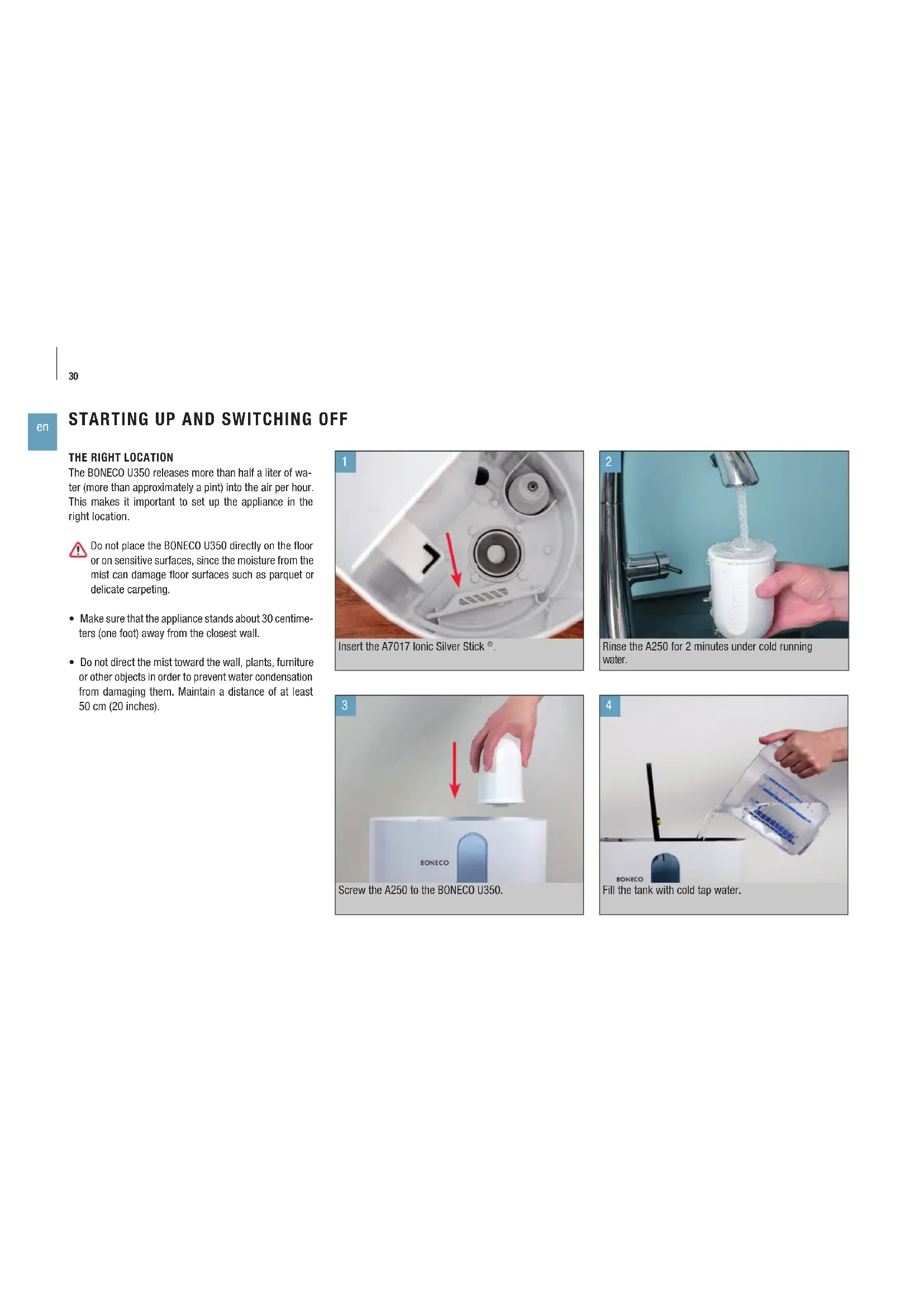 Rinse the A250 for 2 minutes under cold running water. Screw the A250 to the BONECO U350. Fill the tank with cold tap water.
