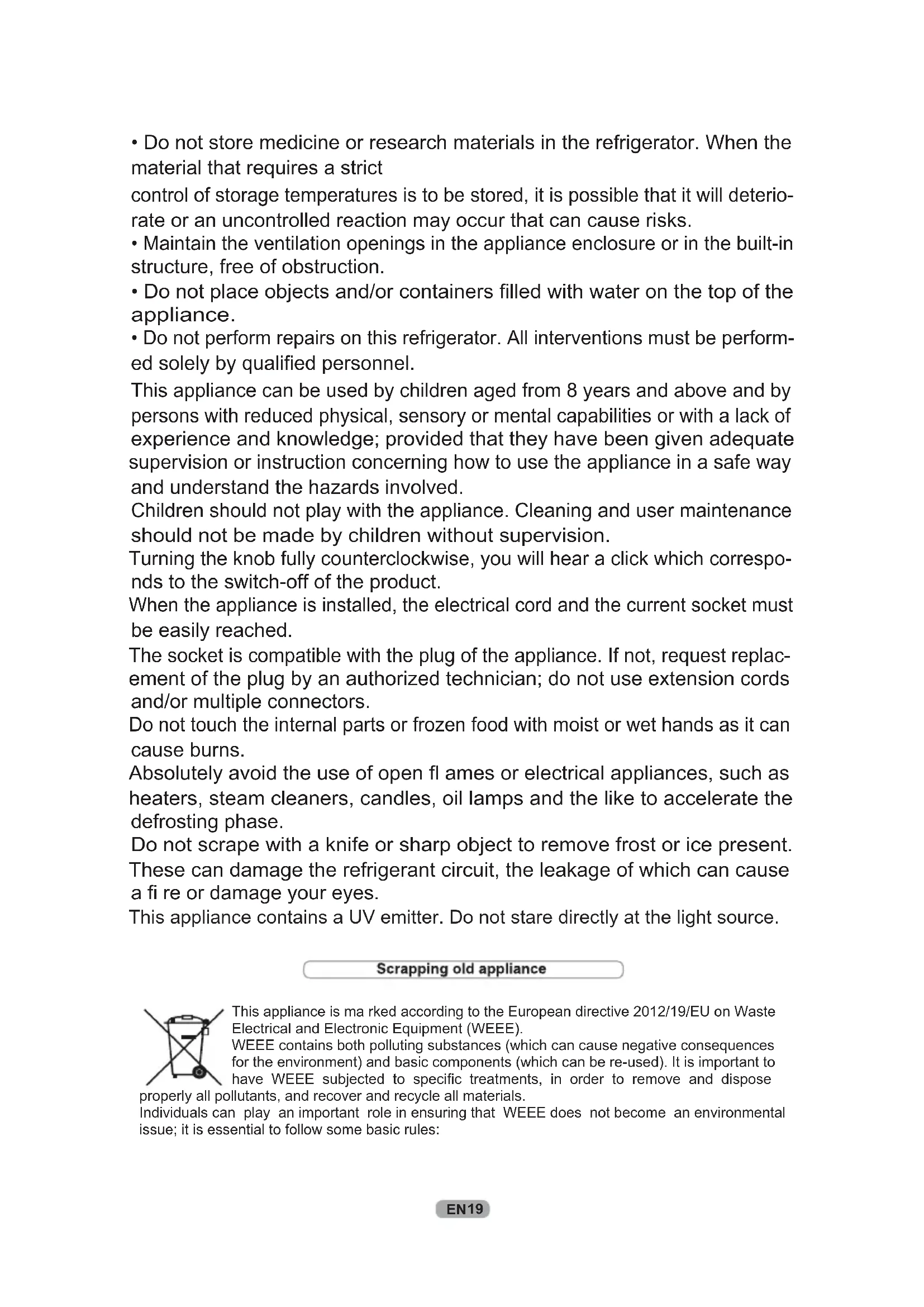 t hands as it can cause burns. ces, such as heaters, steam cleaners, candles, oil lamps and the like to accelerate the defrosting phase. ce present. These can damage the refrigerant circuit, the leakage of which can cause a fi re or damage your eyes.