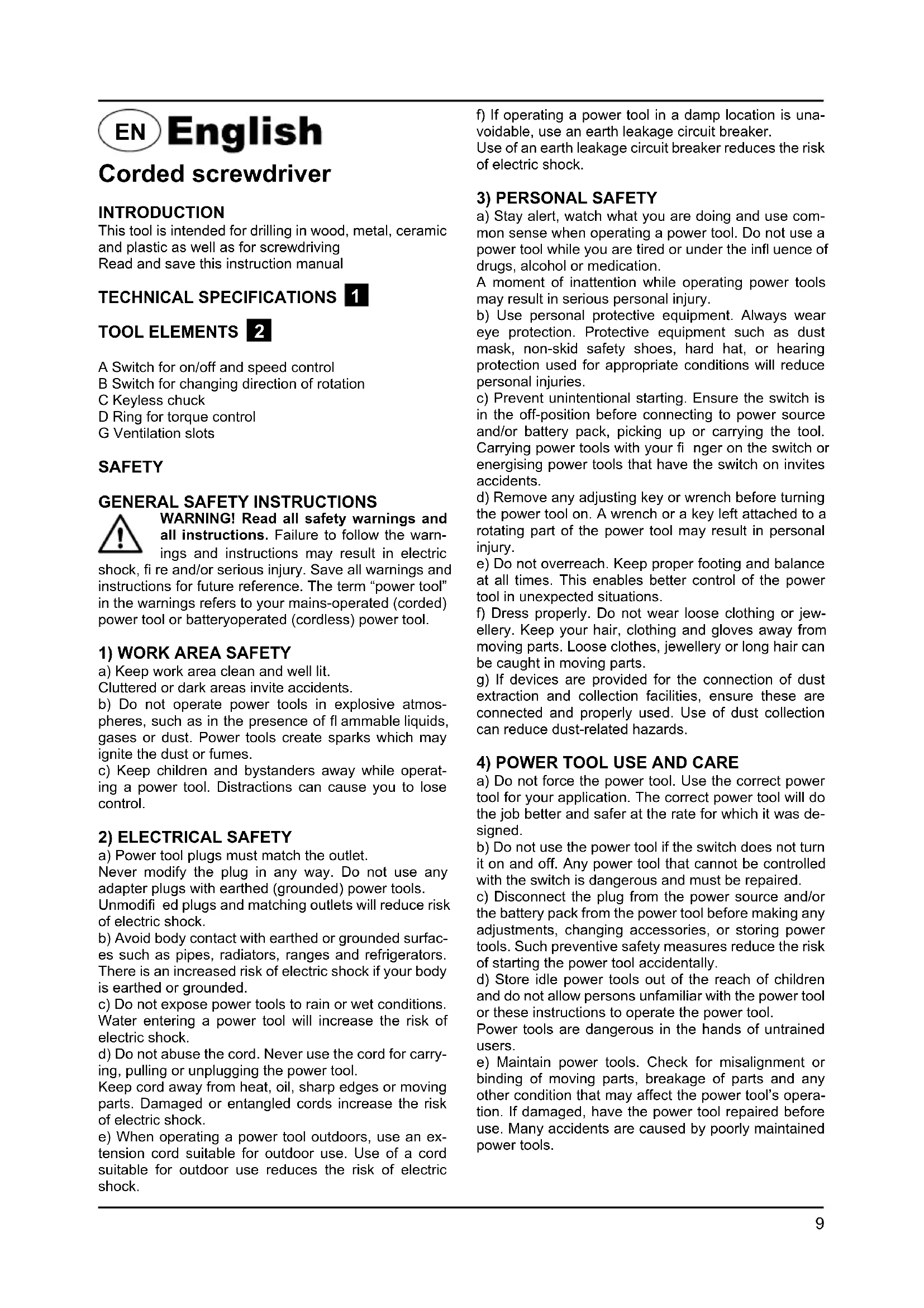 TOOL ELEMENTS 2 A Switch for on/off and speed control B Switch for changing direction of rotation C Keyless chuck D Ring for torque control G Ventilation slots SAFETY