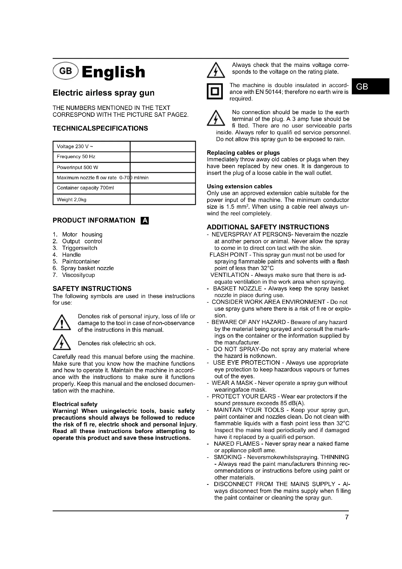 DISCONNECT FROM THE MAINS SUPPLY - ALWAYS disconnect from the mains supply when filling the paint container or cleaning the spray gun. -