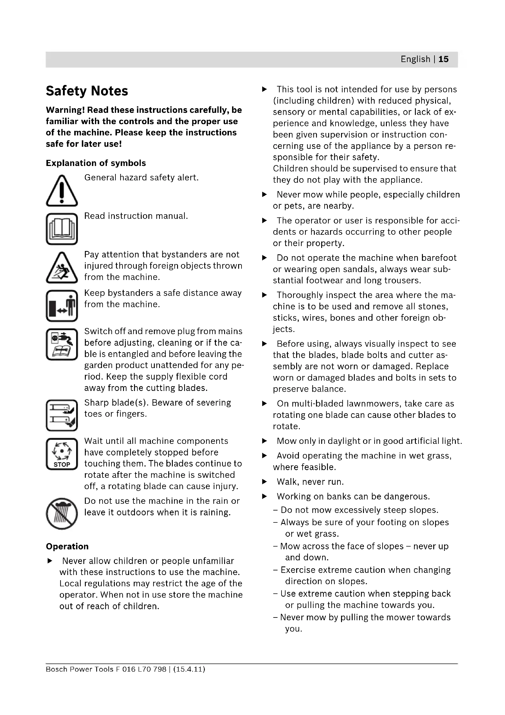 Safety Notes Warning! Read these instructions carefully, be familiar with the controls and the proper use of the machine. Please keep the instructions safe for later use! Explanation of symbols General hazard safety alert. Read instruction manual. Pay attention that bystanders are not injured through foreign objects thrown from the machine. Keep bystanders a safe distance away from the machine. Switch off and remove plug from mains before adjusting, cleaning or if the ca- ble is entangled and before leaving the garden product unattended for any pe- riod. Keep the supply flexible cord away from the cutting blades. Sharp blade(s). Beware of severing toes or fingers. Wait until all machine components have completely stopped before touching them. The blades continue to rotate after the machine is switched off, a rotating blade can cause injury. Do not use the machine in the rain or leave it outdoors when it is raining. Operation f Never allow children or people unfamiliar with these instructions to use the machine. Local regulations may restrict the age of the operator. When not in use store the machine out of reach of children. f This tool is not intended for use by persons (including children) with reduced physical, sensory or mental capabilities, or lack of ex- perience and knowledge, unless they have been given supervision or instruction con- cerning use of the appliance by a person re- sponsible for their safety. Children should be supervised to ensure that they do not play with the appliance. f Never mow while people, especially children or pets, are nearby. f The operator or user is responsible for acci- dents or hazards occurring to other people or their property. f Do not operate the machine when barefoot or wearing open sandals, always wear sub- stantial footwear and long trousers. f Thoroughly inspect the area where the ma- chine is to be used and remove all stones, sticks, wires, bones and other foreign ob- jects. f Before using, always visually inspect to see that the blades, blade bolts and cutter as- sembly are not worn or damaged. Replace worn or damaged blades and bolts in sets to preserve balance. f On multi-bladed lawnmowers, take care as rotating one blade can cause other blades to rotate. f Mow only in daylight or in good artificial light. f Avoid operating the machine in wet grass, where feasible. f Walk, never run. f Working on banks can be dangerous. – Do not mow excessively steep slopes. – Always be sure of your footing on slopes or wet grass. – Mow across the face of slopes – never up and down. – Exercise extreme caution when changing direction on slopes. – Use extreme caution when stepping back or pulling the machine towards you. – Never mow by pulling the mower towards you. STOP OBJ_BUCH-1393-001.book Page 15 Friday, April 15, 2011 10:36 AM16 | English F 016 L70 798 | (15.4.11) Bosch Power Tools f Stop the blades if the machine has to be tilt- ed for transportation when crossing surfaces other than grass and when transporting the machine to and from the area to be mowed. f Do not tilt the machine when starting or switching on the motor, except if the ma- chine has to be tilted for starting in long grass. In this case, do not tilt it more than ab- solutely necessary and tilt only the part which is away from the operator. Always en- sure that both hands are in the operating po- sition before returning the machine to the ground. f Switch on the motor according to the in- structions with feet well away from rotating parts. f Do not put hands or feet near or under rotat- ing parts. f Always stand clear of the discharge zone when operating the machine. f Never pick up or carry the machine while the motor is running. f Never operate the appliance with defective guards or shields, or without safety devices, for example deflectors and/or grass catchers in place. f Be careful during adjustment of the lawn- mower to prevent entrapment of the feet and hands between moving blades and fixed parts of the lawnmower. f Keep supply cables and extension cables away from the blade. The blade can cause damage to the cables and lead to contact with live parts. Beware electric shock hazard. Remove the plug from the socket: – whenever you leave the machine, – before clearing a blockage, – before checking, cleaning or working on the machine, – after striking a foreign object. Inspect the machine for damage and make repairs as necessary, – if the machine starts to vibrate abnormally (check immediately). Power supply f The voltage indicated on the rating plate must correspond to the voltage of the power source. f We recommend that this equipment is only connected into a socket which is protected by a circuit-breaker that would be actuated by a 30 mA residual current. f Only use or replace power supply cables for this unit which correspond to the types indi- cated by the manufacturer. See the operat- ing instructions for the order no. and types. f Never touch the mains plug with wet hands. f Do not run over, crush or pull the power sup- ply cable or extension lead, otherwise it may be damaged. Protect the cable from heat, oil and sharp edges. f The extension lead must have a cross section in accordance with the operating instruc- tions and be protected against splashed wa- ter. The connection must not be in water. f Always wear gardening gloves when handling or working near the sharp blades. Maintenance f Always wear gardening gloves when han- dling or working near the sharp blades. f Keep all nuts, bolts and screws tight to be sure that the machine is in safe working con- dition. f Check the grassbox/bag frequently for wear or deterioration. f Examine the machine and replace worn or damaged parts for safety. f Ensure replacement parts fitted are Bosch approved. Product Description and Speci- fications Read all safety warnings and all in- structions. Failure to follow the warn- ings and instructions may result in electric shock, fire and/or serious inju- ry. OBJ_BUCH-