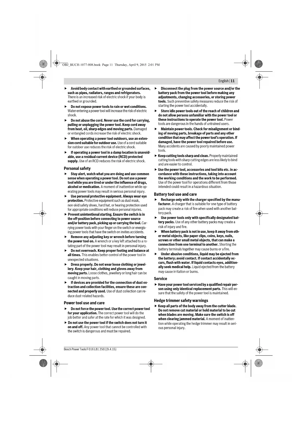 when operating. Do not use the machine in the rain or leave it out- doors when it is raining. Warning! The cutting means continues to move af- ter the motor is switched off. Only use the battery charger indoors. General Power Tool Safety Warnings Read all safety warnings and all instruc- tions. Failure to follow the warnings and instructions may result in electric shock, fire and/or serious injury. Save all warnings and instructions for future reference. The term “power tool” in the warnings refers to your mains- operated (corded) power tool or battery-operated (cordless) power tool. Work area safety Keep work area clean and well lit. Cluttered or dark areas invite accidents. Do not operate power tools in explosive atmospheres, such as in the presence of flammable liquids, gases or dust. Power tools create sparks which may ignite the dust or fumes. Keep children and bystanders away while operating a power tool. Distractions can cause you to lose control. Electrical safety Power tool plugs must match the outlet. Never modify the plug in any way. Do not use any adapter plugs with earthed (grounded) power tools. Unmodified plugs and matching outlets will reduce risk of electric shock. WARNING OBJ_BUCH-1077-008.book Page 10 Thursday, April 9, 2015 2:01 PMEnglish | 11 Bosch Power Tools F 016 L81 250 | (9.4.15) Avoid body contact with earthed or grounded surfaces, such as pipes, radiators, ranges and refrigerators. There is an increased risk of electric shock if your body is earthed or grounded. Do not expose power tools to rain or wet conditions. Water entering a power tool will increase the risk of electric shock. Do not abuse the cord. Never use the cord for carrying, pulling or unplugging the power tool. Keep cord away from heat, oil, sharp edges and moving parts. Damaged or entangled cords increase the risk of electric shock. When operating a power tool outdoors, use an exten- sion cord suitable for outdoor use. Use of a cord suitable for outdoor use reduces the risk of electric shock. If operating a power tool in a damp location is unavoid- able, use a residual current device (RCD) protected supply. Use of an RCD reduces the risk of electric shock. Personal safety Stay alert, watch what you are doing and use common sense when operating a power tool. Do not use a power tool while you are tired or under the influence of drugs, alcohol or medication. A moment of inattention while op- erating power tools may result in serious personal injury. Use personal protective equipment. Always wear eye protection. Protective equipment such as dust mask, non-skid safety shoes, hard hat, or hearing protection used for appropriate conditions will reduce personal injuries. Prevent unintentional starting. Ensure the switch is in the off-position before connecting to power source and/or battery pack, picking up or carrying the tool. Car- rying power tools with your finger on the switch or energis- ing power tools that have the switch on invites accidents. Remove any adjusting key or wrench before turning the power tool on. A wrench or a key left attached to a ro- tating part of the power tool may result in personal injury. Do not overreach. Keep proper footing and balance at all times. This enables better control of the power tool in unexpected situations. Dress properly. Do not wear loose clothing or jewel- lery. Keep your hair, clothing and gloves away from moving parts. Loose clothes, jewellery or long hair can be caught in moving parts. If devices are provided for the connection of dust ex- traction and collection facilities, ensure these are con- nected and properly used. Use of dust collection can re- duce dust-related hazards. Power tool use and care Do not force the power tool. Use the correct power tool for your application. The correct power tool will do the job better and safer at the rate for which it was designed. Do not use the power tool if the switch does not turn it on and off. Any power tool that cannot be controlled with the switch is dangerous and must be repaired. Disconnect the plug from the power source and/or the battery pack from the power tool before making any adjustments, changing accessories, or storing power tools. Such preventive safety measures reduce the risk of starting the power tool accidentally. Store idle power tools out of the reach of children and do not allow persons unfamiliar with the power tool or these instructions to operate the power tool. Power tools are dangerous in the hands of untrained users. Maintain power tools. Check for misalignment or bind- ing of moving parts, breakage of parts and any other condition that may affect the power tool’s operation. If damaged, have the power tool repaired before use. Many accidents are caused by poorly maintained power tools. Keep cutting tools sharp and clean. Properly maintained cutting tools with sharp cutting edges are less likely to bind and are easier to control. Use the power tool, accessories and tool bits etc. in ac- cordance with these instructions, taking into account the working conditions and the work to be performed. Use of the power tool for operations different from those intended could result in a hazardous situation. Battery tool use and care Recharge only with the charger specified by the manu- facturer. A charger that is suitable for one type of battery pack may create a risk of fire when used with another bat- tery pack. Use power tools only with specifically designated bat- tery packs. Use of any other battery packs may create a risk of injury and fire. When battery pack is not in use, keep it away from oth- er metal objects, like paper clips, coins, keys, nails, screws or other small metal objects, that can make a connection from one terminal to another. Shorting the battery terminals together may cause burns or a fire. Under abusive conditions, liquid may be ejected from the battery; avoid contact. If contact accidentally oc- curs, flush with water. If liquid contacts eyes, addition- ally se
