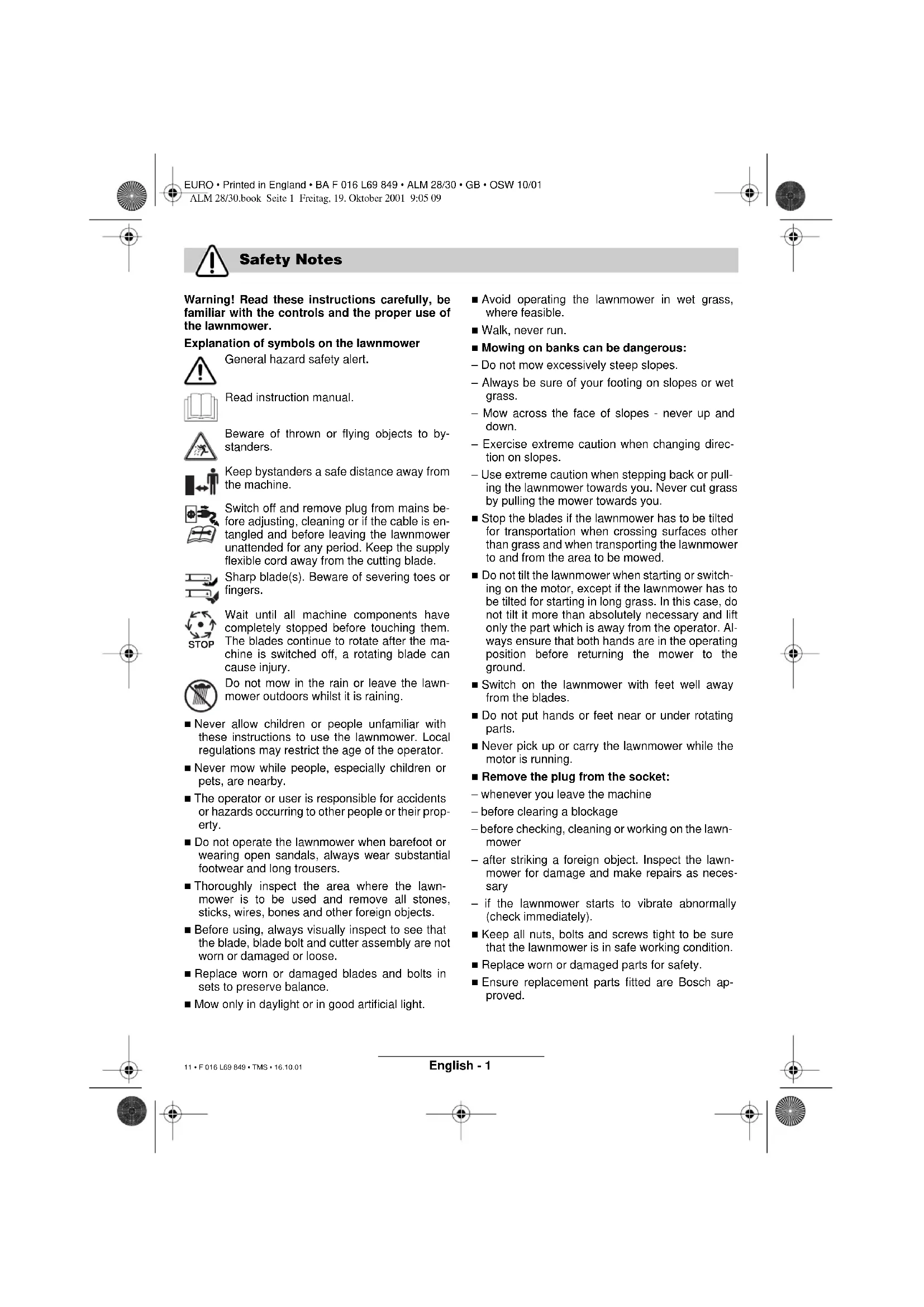 ALM 28/30.book Seite 2 Freitag, 19. Oktober 2001 9:05 0912 • F 016 L69 849 • TMS • 16.10.01EURO • Printed in England • BA F 016 L69 849 • ALM 28/30 • GB • OSW 10/01 English - 3 ➊ Position the handle bottom 6 at the rear of the motor cover. ➋ Line up the holes and secure with the pivot pins 9 provided. ➌ Attach the handle top 3 with the bolts and wing nuts 7 to the handle bottom 6. Note: Ensure that the cable clips 8 supplied are used to fix the cable to the handle. Attach cable to cable restraint 5 ensuring that sufficient cable slack is available. The handle can be set in three positions, as in figure C: I Park position II Handle location for mowing III Handle location to enable mower to be hung on walls. To move the handle from location I or III to mowing location II press together the tubes of the handle bottom 6. Stop, release switch lever, wait until the motor stops and remove the plug before adjusting height. The blades continue to rotate after the machine is switched off, a rotating blade can cause injury. For the first cutting of the season, a high cutting ad- justment should be selected. Your machine has two settings which give the fol- lowing approximate height of cuts: low = 20 mm high = 30 mm To change the height of cut, place the handle in the park position and turn the mower on its side and hold onto the fan 13 (figure D): ➊ Turn the cutting disc 11 relative to the fan 13 to unlock the cutting disc. ➋ Push/pull the cutting disc 11 on low or high cutting position. ➌ Turn the cutting disc 11 relative to the fan 13 to lock the cutting disc. The blade continues to rotate for a few seconds after the machine is switched off. Allow the motor/blade to stop rotating be- fore switching “on” again. Do not rapidly switch off and on. To aid starting tilt mower to side. Starting: Press and hold the safety button 2. (Figure E) Squeeze the switch lever 1 towards the han- dle. Release the safety button 2. Stopping: Release the switch lever 1. The motor cover is designed with a flexible mounting and tilts to improve directional control. Place the lawnmower on the edge of the lawn, as close to the power point as possible. Work away from the power point as in figure F. Then at right an- gles. Position the cable to opposite side (already cut) at the end of each turn. When mowing do not allow the motor to la- bour particularly in heavy conditions. When the motor labours the speed of the mo- tor drops and you will hear a change in the motor sound, when this occurs stop mowing, release switch lever and raise the height of cut. Failure to do so could damage the ma- chine. Stop and remove plug from the power sup- ply. Note: To ensure long and reliable service, carry out the following maintenance regularly. Regularly check for obvious defects such as a loose, dislodged or damaged blade, loose fixings, and worn or damaged components. Check that covers and guards are undamaged and correctly fitted. Carry out necessary maintenance or repairs before using. If the mower should happen to fail despite the care taken in manufacture and testing, repair should be carried out by an authorised customer service agent for Bosch garden products. Assembly Handle Adjustment Adjusting the Cutting Height