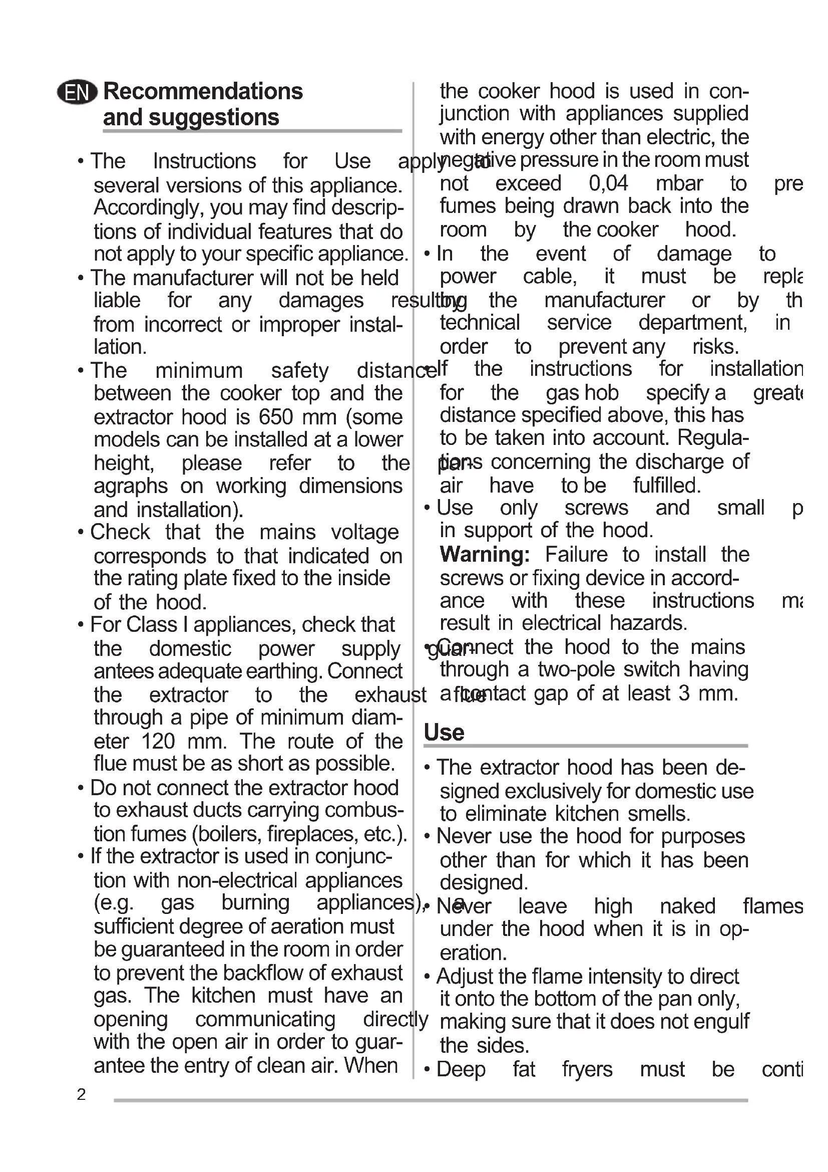 - Iftheextractorisusedinconjunc- tion with non-electrical appliances (e.g. gas burning appliances), a sufcientdegreeofaerationmust be guaranteed in the room in order topreventthebackowofexhaust gas. The kitchen must have an opening communicating directly with the open air in order to guar- anteetheentryofcleanair.When the cooker hood is used in con- junction with appliances supplied withenergyotherthanelectric,the negative pressure in the room must not exceed 0,04 mbar to prevent fumes being drawn back into the room by thecooker hood.