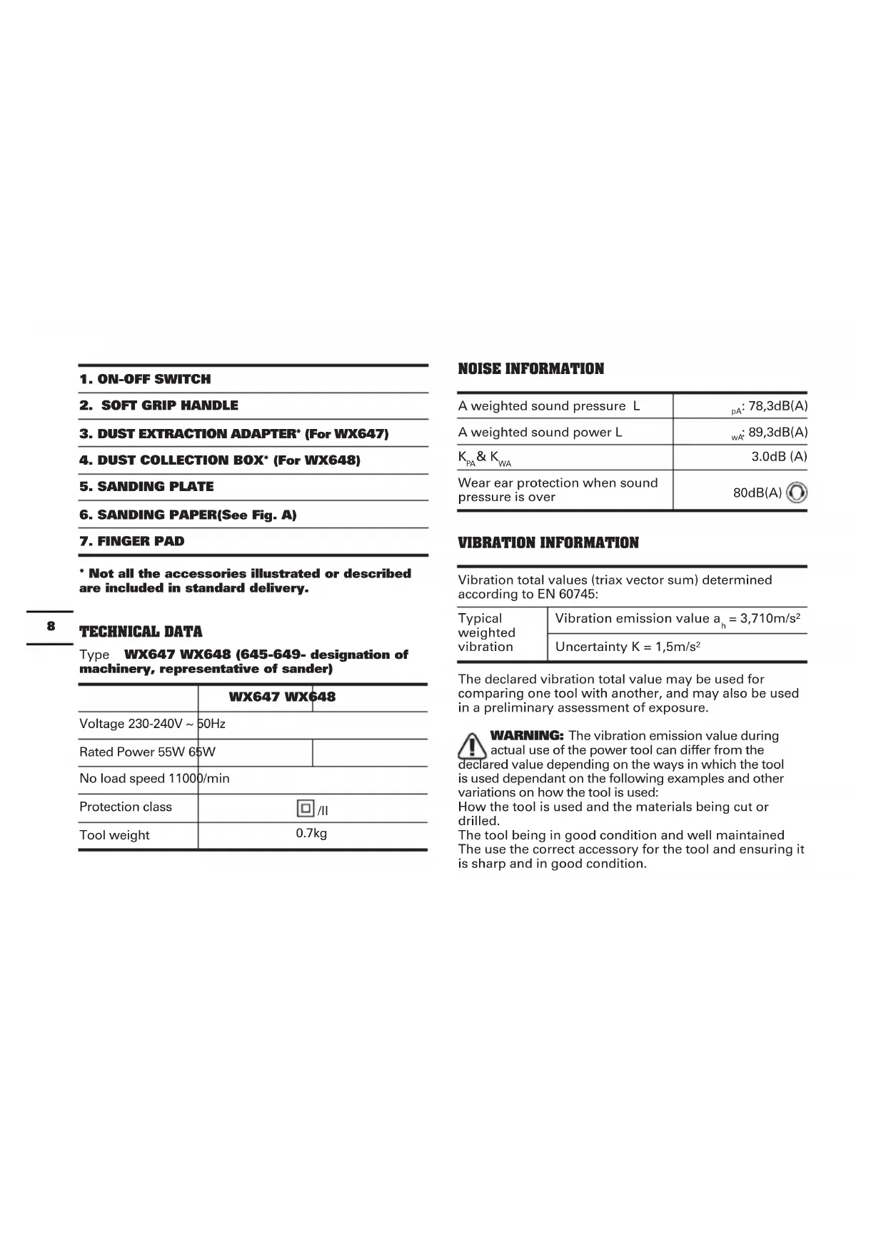 - Not all the accessories illustrated or described are included in standard delivery. TECHNICAL DATA Type WX647 WX648 (645-649- designation of machinery, representative of sander) WX647 WX648 Voltage 230-240V ~ 50Hz Rated Power 55W 65W No load speed 11000/min Protection class /ll Tool weight 0.7kg NOISE INFORMATION A weighted sound pressure L