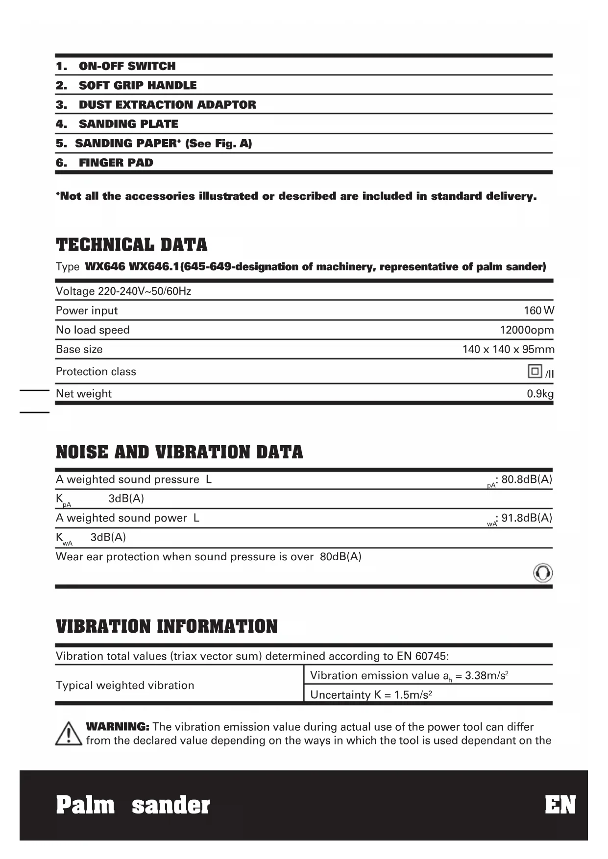 *Not all the accessories illustrated or described are included in standard delivery. Voltage 220-240V~50/60Hz Power input 160 W No load speed 12000opm Base size 140 x 140 x 95mm Protection class /ll Net weight 0.9kg TECHNICAL DATA Type WX646 WX646.1(645-649-designation of machinery, representative of palm sander)Palm sander EN