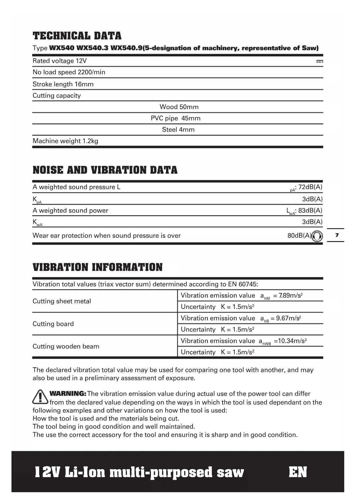 TECHNICAL DATA Type WX540 WX540.3 WX540.9(5-designation of machinery, representative of Saw) Rated voltage 12V No load speed 2200/min Stroke length 16mm Cutting capacity Wood 50mm PVC pipe 45mm Steel 4mm Machine weight 1.2kg