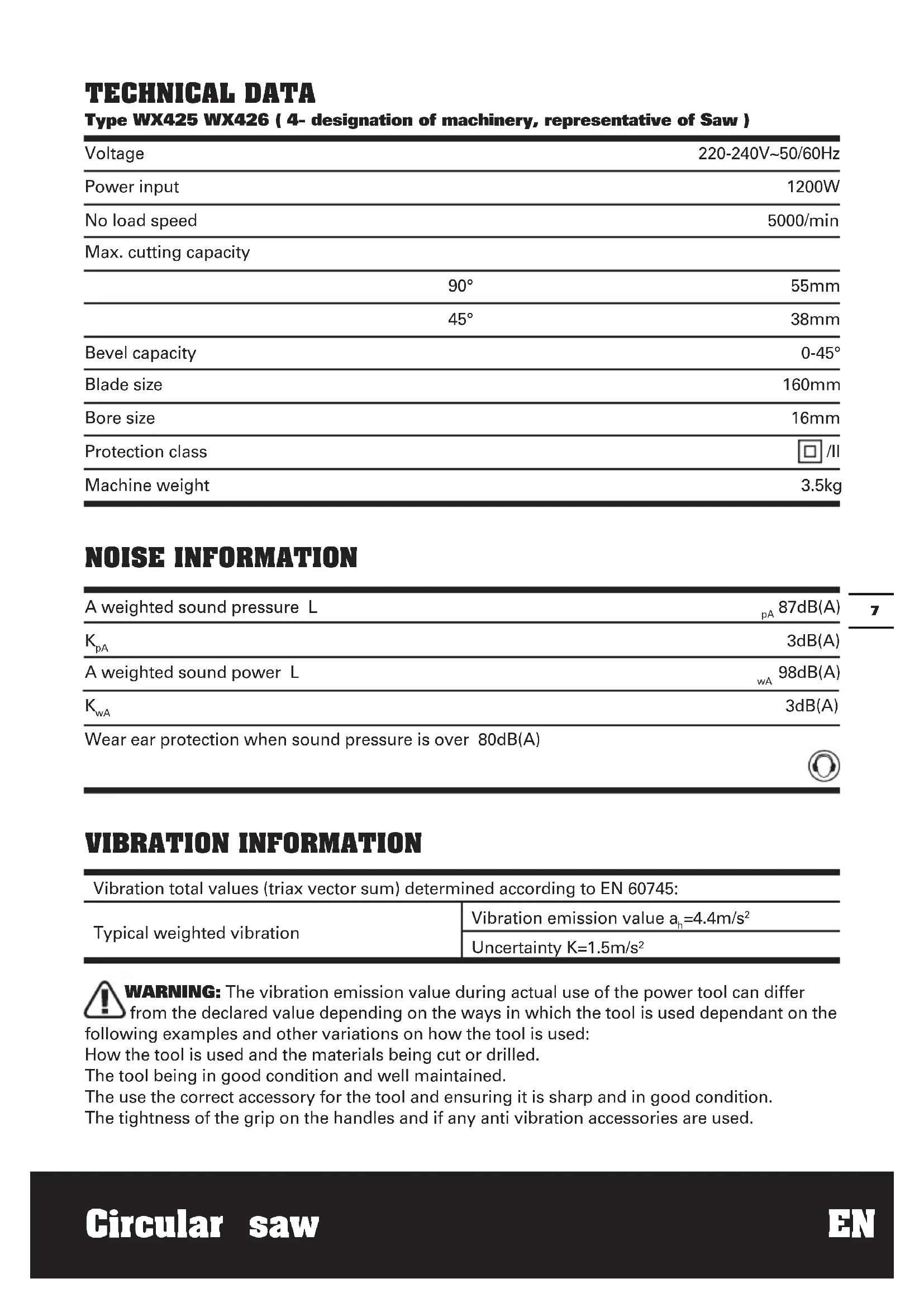 from the declared value depending on the ways in which the tool is used dependant on the following examples and other variations on how the tool is used: How the tool is used and the materials being cut or drilled. The tool being in good condition and well maintained. The use the correct accessory for the tool and ensuring it is sharp and in good condition. The tightness of the grip on the handles and if any anti vibration accessories are used. Voltage Power input No load speed Max. cutting capacity 90° 45° Bevel capacity Blade size Bore size Protection class Machine weight 220-240V~50/60Hz 1200W 5000/min 55mm 38mm 0-45° 160mm 16mm /II 3.5kg Type WX425 WX426 ( 4- designation of machinery, representative of Saw )Circular saw EN