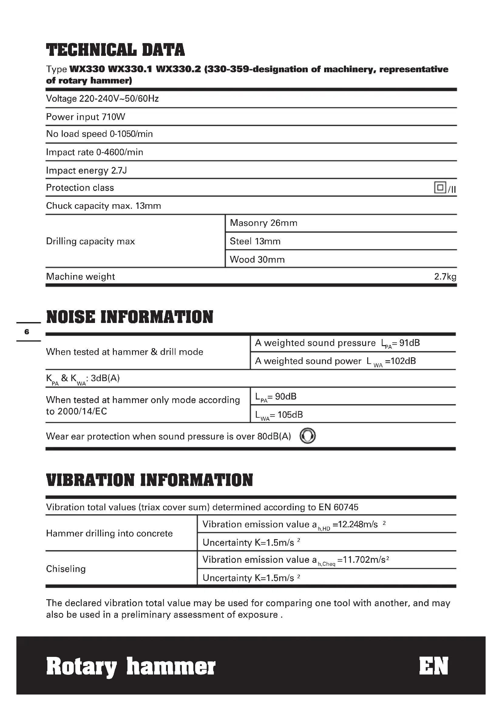 TECHNICAL DATA Type WX330 WX330.1 WX330.2 (330-359-designation of machinery, representative of rotary hammer) Voltage 220-240V~50/60Hz Power input 710W No load speed 0-1050/min Impact rate 0-4600/min Impact energy 2.7J Protection class /II Chuck capacity max. 13mm Drilling capacity max Masonry 26mm Steel 13mm Wood 30mm Machine weight 2.7kg NOISE INFORMATION When tested at hammer & drill mode A weighted sound pressure L