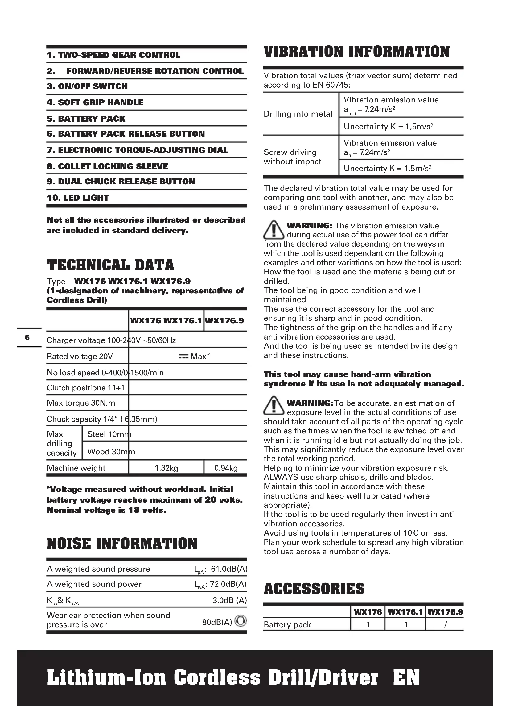 Not all the accessories illustrated or described are included in standard delivery. TECHNICAL DATA Type WX176 WX176.1 WX176.9 (1-designation of machinery, representative of Cordless Drill) WX176 WX176.1 WX176.9 Charger voltage 100-240V ~50/60Hz Rated voltage 20V Max* No load speed 0-400/0-1500/min Clutch positions 11+1 Max torque 30N.m Chuck capacity 1/4” ( 6.35mm) Max. drilling capacity Steel 10mm Wood 30mm Machine weight 1.32kg 0.94kg *Voltage measured without workload. Initial battery voltage reaches maximum of 20 volts. Nominal voltage is 18 volts. NOISE INFORMATION A weighted sound pressure L