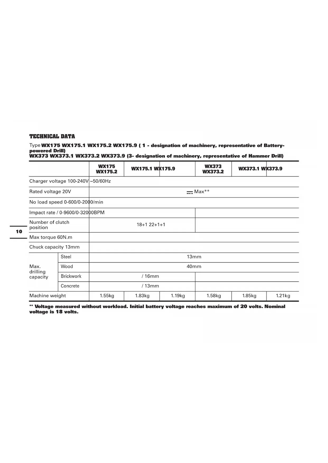 - Not all the accessories illustrated or described are included in standard delivery.10 TECHNICAL DATA Type WX175 WX175.1 WX175.2 WX175.9 ( 1 - designation of machinery, representative of Battery- powered Drill) WX373 WX373.1 WX373.2 WX373.9 (3- designation of machinery, representative of Hammer Drill) WX175 WX175.2 WX175.1 WX175.9 WX373 WX373.2 WX373.1 WX373.9 Charger voltage 100-240V ~50/60Hz Rated voltage 20V Max** No load speed 0-600/0-2000/min Impact rate / 0-9600/0-32000BPM Number of clutch position 18+1 22+1+1 Max torque 60N.m Chuck capacity 13mm Max. drilling capacity Steel 13mm Wood 40mm Brickwork / 16mm Concrete / 13mm Machine weight 1.55kg 1.83kg 1.19kg 1.58kg 1.85kg 1.21kg ** Voltage measured without workload. Initial battery voltage reaches maximum of 20 volts. Nominal voltage is 18 volts.11 NOISE INFORMATION A weighted sound pressure L