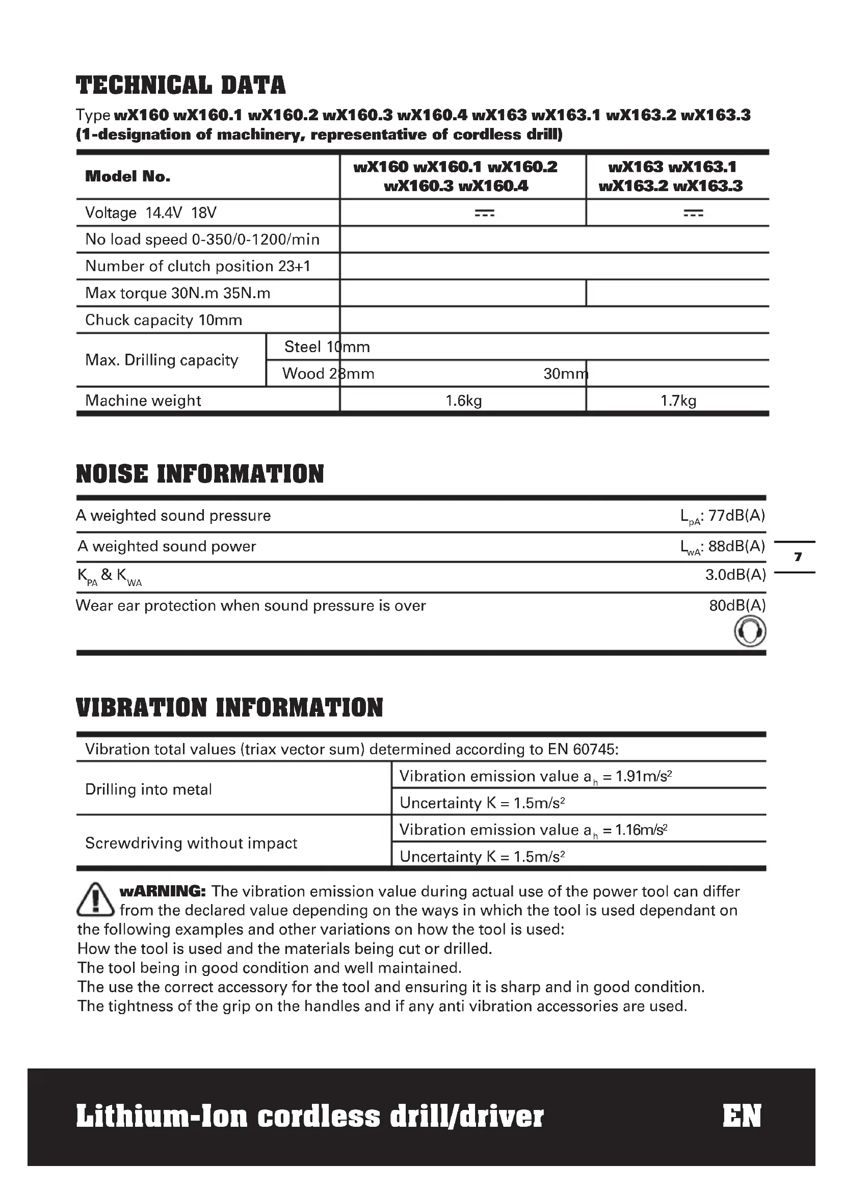 from the declared value depending on the ways in which the tool is used dependant on the following examples and other variations on how the tool is used: How the tool is used and the materials being cut or drilled. The tool being in good condition and well maintained. The use the correct accessory for the tool and ensuring it is sharp and in good condition. The tightness of the grip on the handles and if any anti vibration accessories are used.Lithium-Ion cordless drill/driver EN