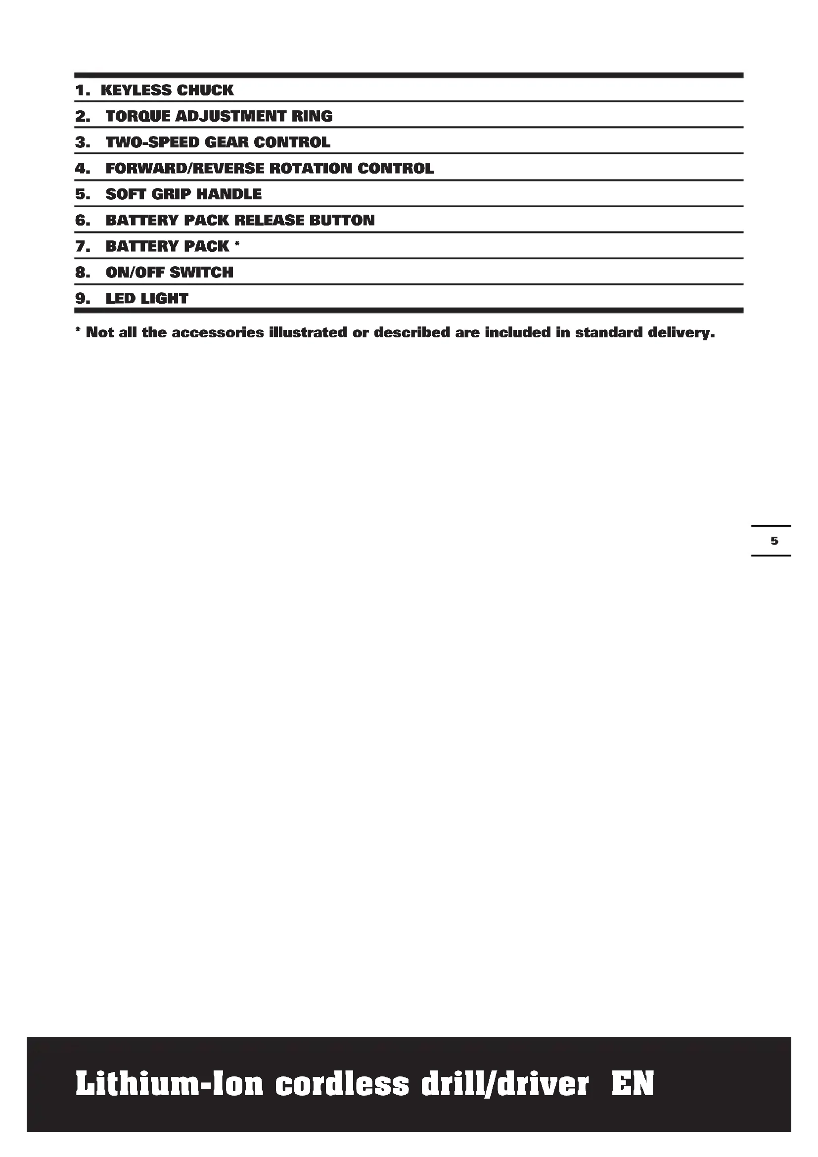 - Not all the accessories illustrated or described are included in standard delivery.Lithium-Ion cordless drill/driver EN