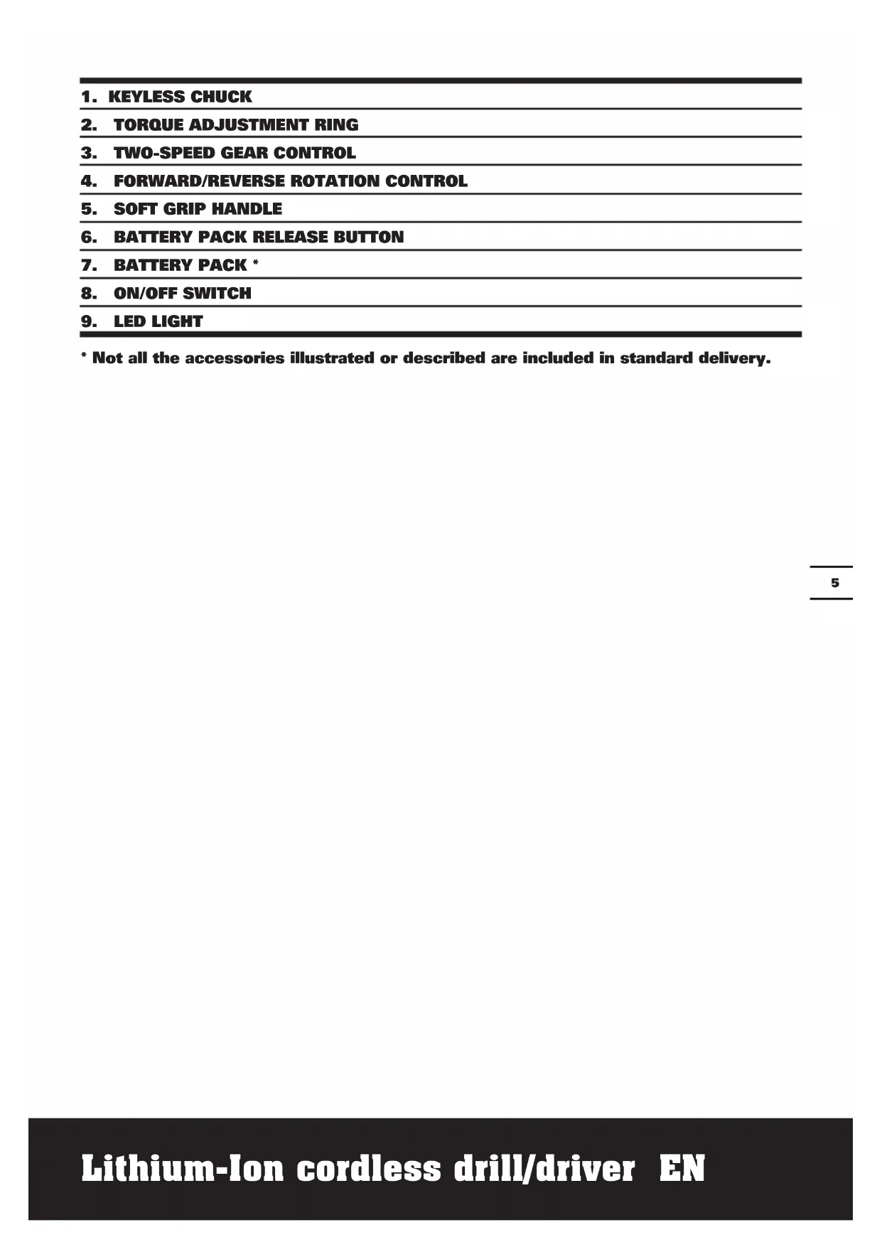 - Not all the accessories illustrated or described are included in standard delivery.Lithium-Ion cordless drill/driver EN