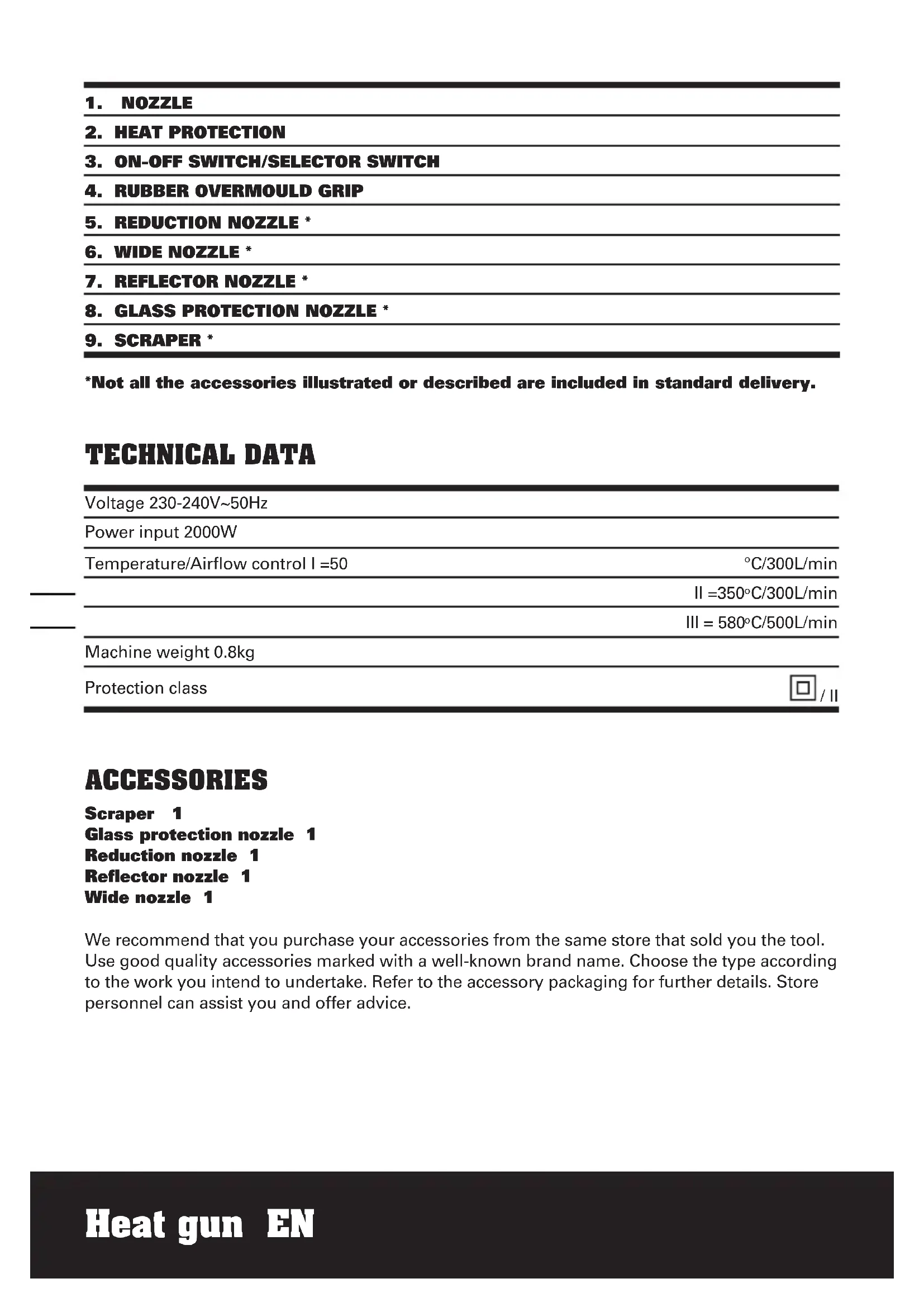 C/500L/min Machine weight 0.8kg Protection class / II ACCESSORIES Scraper 1 Glass protection nozzle 1 Reduction nozzle 1 Reflector nozzle 1 Wide nozzle 1 We recommend that you purchase your accessories from the same store that sold you the tool. Use good quality accessories marked with a well-known brand name. Choose the type according to the work you intend to undertake. Refer to the accessory packaging for further details. Store personnel can assist you and offer advice.Heat gun EN