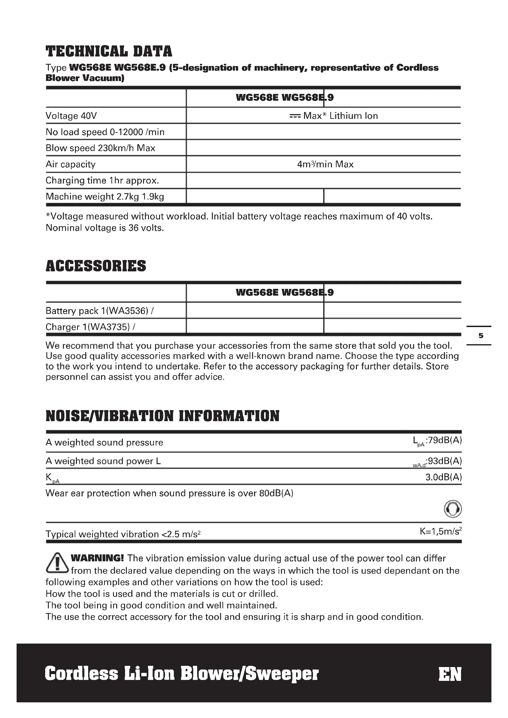 WARNING! The vibration emission value during actual use of the power tool can differ from the declared value depending on the ways in which the tool is used dependant on the following examples and other variations on how the tool is used: How the tool is used and the materials is cut or drilled. The tool being in good condition and well maintained. The use the correct accessory for the tool and ensuring it is sharp and in good condition.6 Cordless Li-Ion Blower/Sweeper