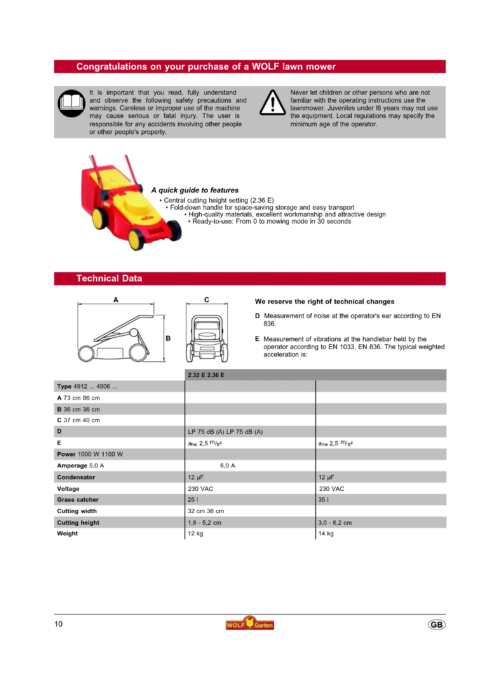 When in doubt, always consult a WOLF service workshop. Important: switch off the mower and disconnect the mains plug before inspecting, cleaning or working on the blades. Spare parts Item number Order description Product information 4932 902 Grass catcher (2.32 E) 4936 902 Grass catcher (2.36 E) 4932 090 Vi 32 N Replacement blade 32 cm (2.32 E) 4936 090 Vi 36 N Replacement blade 36 cm (2.36 E) Supplied by your dealer The guarantee services will be performed by our authorized repair shops or: Guarantee terms Please carefully retain the guarantee card completed by the seller, or the proof of purchase. The company WOLF-Garten provides a guarantee for 24 months from the date of purchase. This guarantee is in accordance with the relevant state of technology and the utilisation purpose / area of application. The consumer‘s statutory rights are not affected by the following guarantee guidelines. Pre-conditions for the 24-month guarantee entitlement: - Deployment of the device solely for private use. The guarantee is reduced to 12 months in the commercial sector or leasing business. - Proper handling and observance of all information given in the operating manual, which forms part of our guarantee terms. - Observance of the prescribed maintenance intervals. - No unauthorised alteration of the design. - Installation of original WOLF replacement parts / accessories. - Presentation of the completed guarantee card and/or proof of purchase. This guarantee does not extend to normal wear-and-tear on blades, blade mounting components or friction disks, V-belts/toothed belts, running wheels/tyres, air filters, spark plugs and spark plug connectors. Any guarantee claim shall be immediately void in the event of unauthorised repairs. Faults and defects which can be traced to material or manufacturing faults will be rectified exclusively by our contracted workshops (the seller has the right to remedy a defect) in your vicinity, or by the manufacturer if the latter is closer. Any claims going beyond the provision of a guarantee are ruled out. There is no entitlement to a replacement. Any transport damage should be reported not to us but to the shipper in question since, otherwise, any compensation claims vis-à-vis the shipper would be voided. WOLFGarden Ltd. Crown BusinessPark Tredegar Gwent, NP22 4EF Tel.: ++ 44 / 14 95 30 66 00 Fax: ++ 44 / 14 95 30 33 44 E-mail: info@uk.WOLF-Garten.com www.WOLF-Garten.com 13Donnés Techniques D Mesurage du bruit au niveau de l'oreille de l'opérateur selon EN 836.