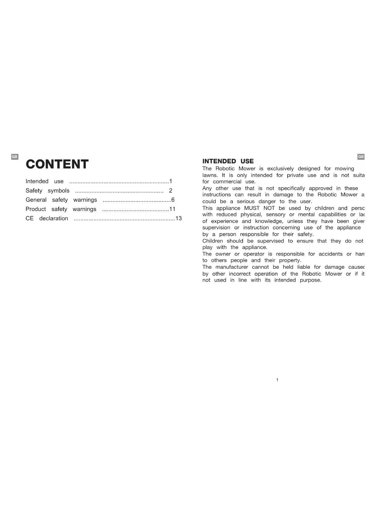 - INTENDED USE The Robotic Mower is exclusively designed for mowing lawns. It is only intended for private use and is not suitable for commercial use. Any other use that is not specifically approved in these instructions can result in damage to the Robotic Mower and could be a serious danger to the user. This appliance MUST NOT be used by children and persons with reduced physical, sensory or mental capabilities or lack of experience and knowledge, unless they have been given supervision or instruction concerning use of the appliance by a person responsible for their safety. Children should be supervised to ensure that they do not play with the appliance. The owner or operator is responsible for accidents or harm to others people and their property. The manufacturer cannot be held liable for damage caused by other incorrect operation of the Robotic Mower or if it is not used in line with its intended purpose. CONTENT Intended use p. 1