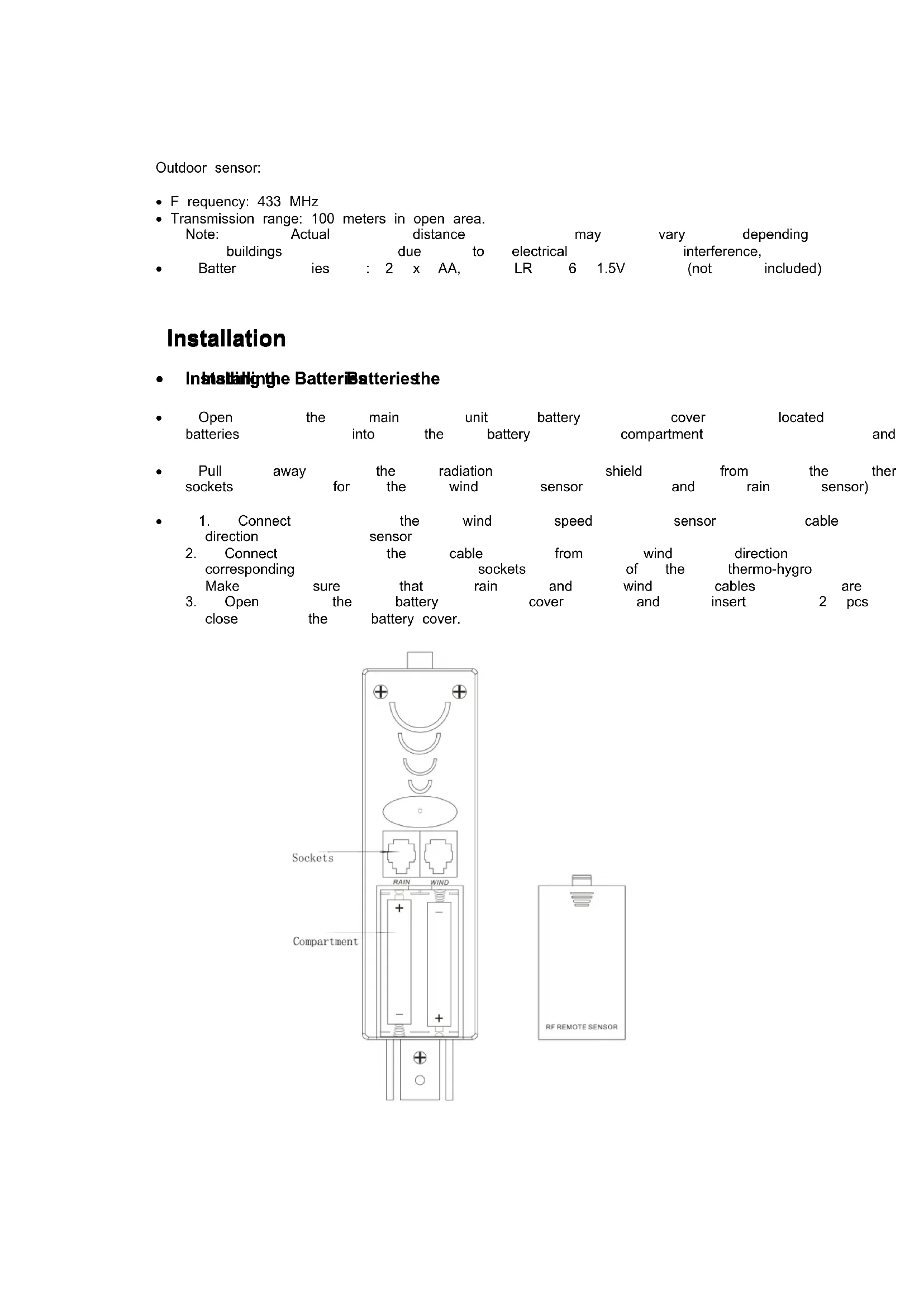 First insert the batteries of main unit, then insert the batteries of the outdoor sensor within 3 minutes after the main unit is powered on, to assure that the sensor data is received well. In case of the outdoor sensor data is not received, please press