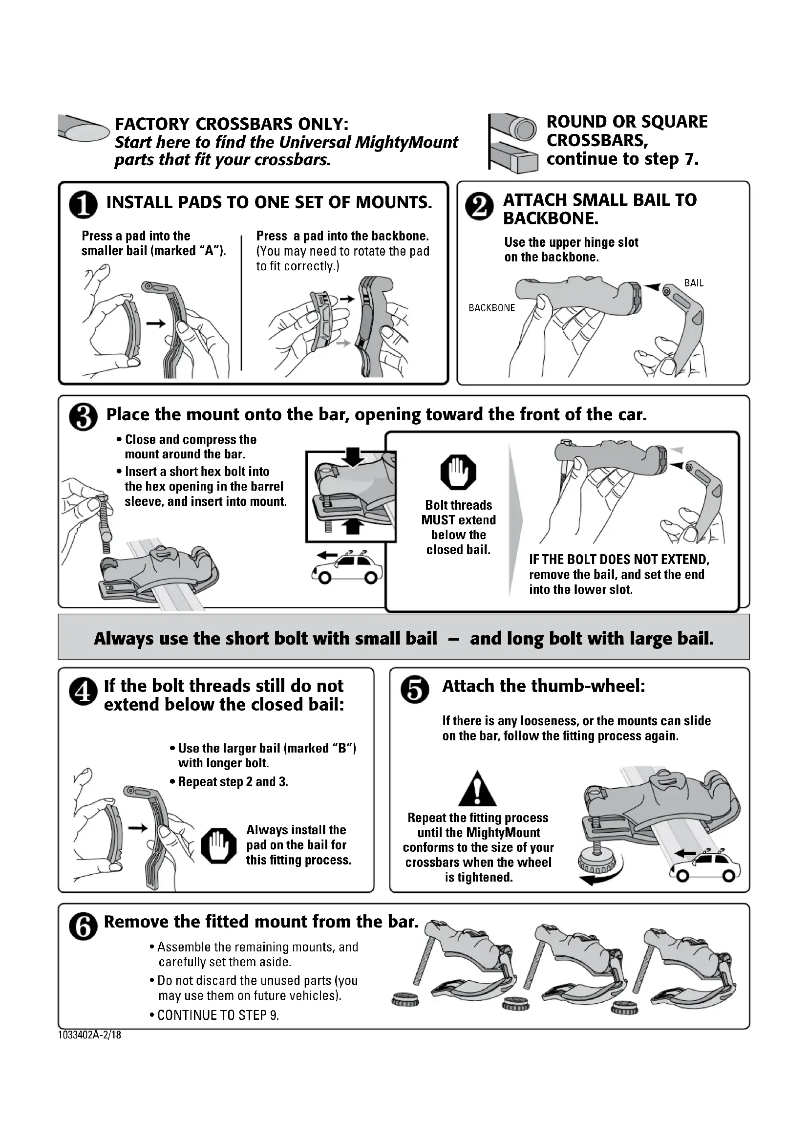 BACKBONE. IF THE BOLT DOES NOT EXTEND, remove the bail, and set the end into the lower slot. Bolt threads MUST extend below the closed bail. If the bolt threads still do not extend below the closed bail: Always install the pad on the bail for this fitting process. Attach the thumb-wheel: If there is any looseness, or the mounts can slide on the bar, follow the fitting process again. FACTORY CROSSBARS ONLY: Start here to find the Universal MightyMount parts that fit your crossbars. Remove the fitted mount from the bar. BAIL BACKBONE Repeat the fitting process until the MightyMount conforms to the size of your crossbars when the wheel is tightened.