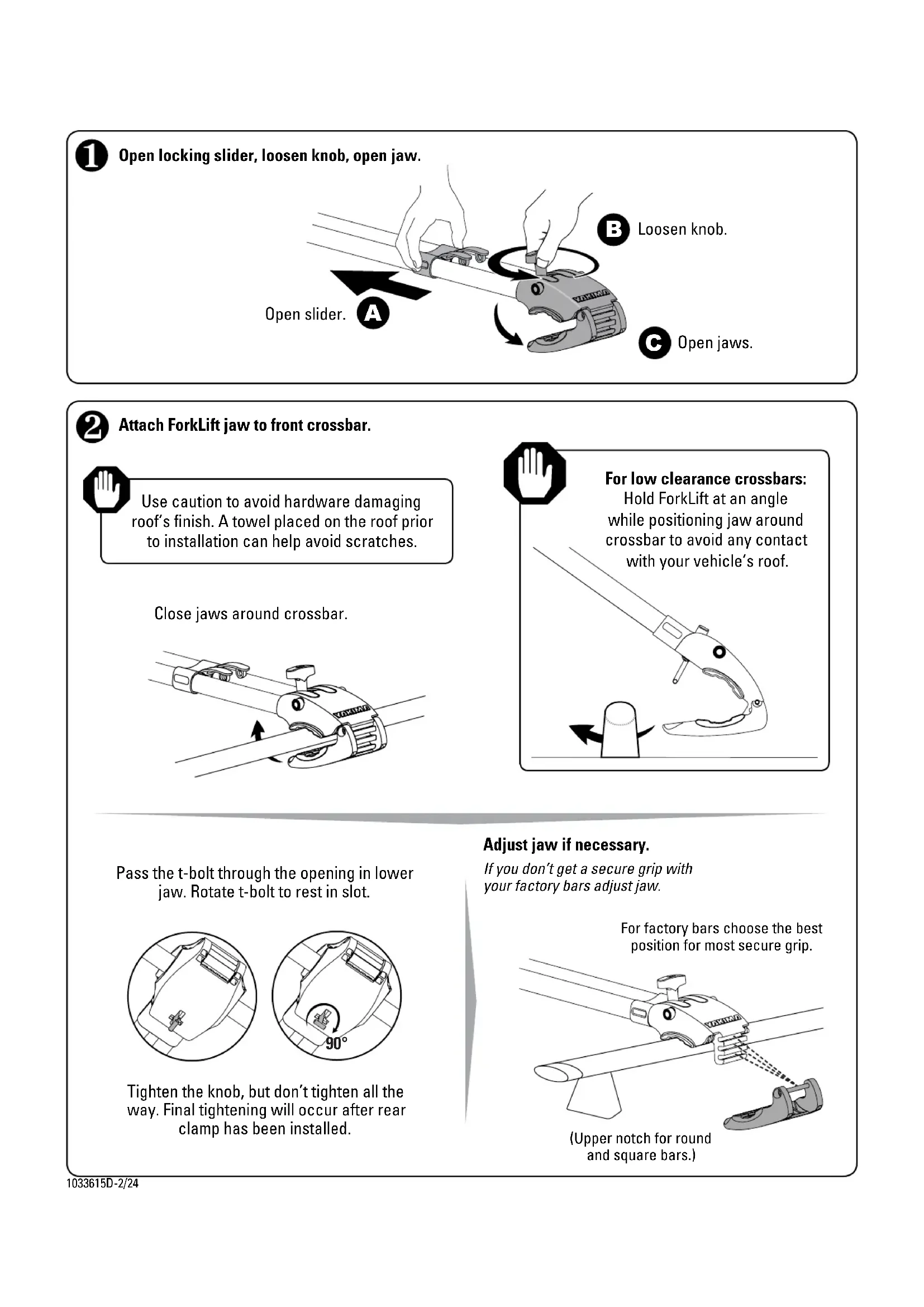 1033615D-1/24 IT IS CRITICAL THAT ALL YAKIMA RACKS AND ACCESSORIES BE PROPERLY AND SECURELY ATTACHED TO YOUR VEHICLE. IMPROPER ATTACHMENT COULD RESULT IN AN AUTOMOBILE ACCIDENT, AND COULD CAUSE SERIOUS BODILY INJURY OR DEATH TO YOU OR TO OTHERS. YOU ARE RESPONSIBLE FOR SECURING THE RACKS AND ACCESSORIES TO YOUR CAR, CHECKING THE ATTACHMENTS PRIOR TO USE, AND PERIODICALLY INSPECTING THE PRODUCTS FOR ADJUSTMENT, WEAR, AND DAMAGE. THEREFORE, YOU MUST READ AND UNDERSTAND ALL OF THE INSTRUCTIONS AND CAUTIONS SUPPLIED WITH YOUR YAKIMA PRODUCT PRIOR TO INSTALLATION OR USE. IF YOU DO NOT UNDERSTAND ALL OF THE INSTRUCTIONS AND CAUTIONS, OR IF YOU HAVE NO MECHANICAL EXPERIENCE AND ARE NOT THOROUGHLY FAMILIAR WITH THE INSTALLATION PROCEDURES, YOU SHOULD HAVE THE PRODUCT INSTALLED BY A PROFESSIONAL INSTALLER. FORKLIFT (1X) LOCKING SKEWER (1X) END CAP (1X) VINYL CAP (1X) CROSSBAR SPREAD *CROSSBAR SPREAD Your crossbar spread is the distance between the crossbars. DO NOT EXCEED RACK WEIGHT LIMITS! Forks with Safety Tabs DESIGNED FOR FORKS WITH SAFETY TABS. Round Bar Load Min. and Max. Crossbar Spread* Limits StreamLine Bar Type of Rack Square Bar 16" - 42" 41cm - 107cm 1 or more bikes 16” spread = 35 lbs. / bike 41cm spread 15.9Kg / bike 18" - 42" 46cm - 107cm 3 or more bikes 18” spread = 40 lbs. / bike 46cm spread 15.9Kg / bike90° 1033615D-2/24 Open jaws. Attach ForkLift jaw to front crossbar. Close jaws around crossbar. Pass the t-bolt through the opening in lower jaw. Rotate t-bolt to rest in slot. Tighten the knob, but don’t tighten all the way. Final tightening will occur after rear clamp has been installed. Open slider. Use caution to avoid hardware damaging roof’s finish. A towel placed on the roof prior to installation can help avoid scratches. Loosen knob. Open locking slider, loosen knob, open jaw. For low clearance crossbars: Hold ForkLift at an angle while positioning jaw around crossbar to avoid any contact with your vehicle’s roof. For factory bars choose the best position for most secure grip. Adjust jaw if necessary. (Upper notch for round and square bars.) If you don’t get a secure grip with your factory bars adjust jaw.