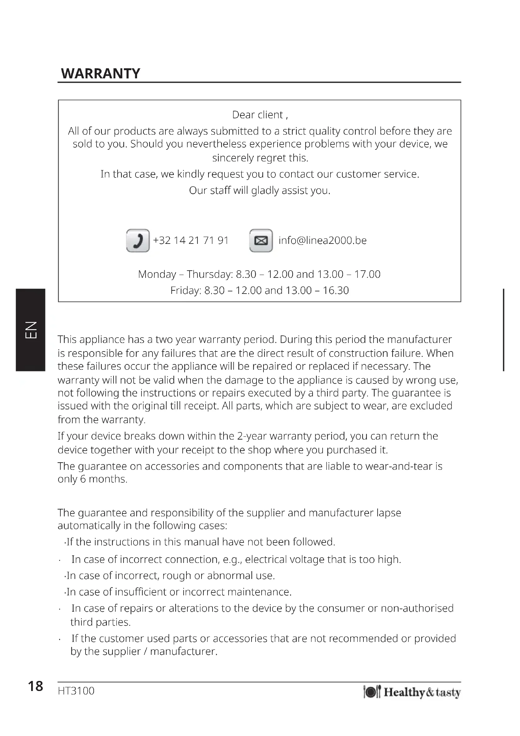 This appliance has a two year warranty period. During this period the manufacturer is responsible for any failures that are the direct result of construction failure. When these failures occur the appliance will be repaired or replaced if necessary. The warranty will not be valid when the damage to the appliance is caused by wrong use, not following the instructions or repairs executed by a third party. The guarantee is issued with the original till receipt. All parts, which are subject to wear, are excluded from the warranty.