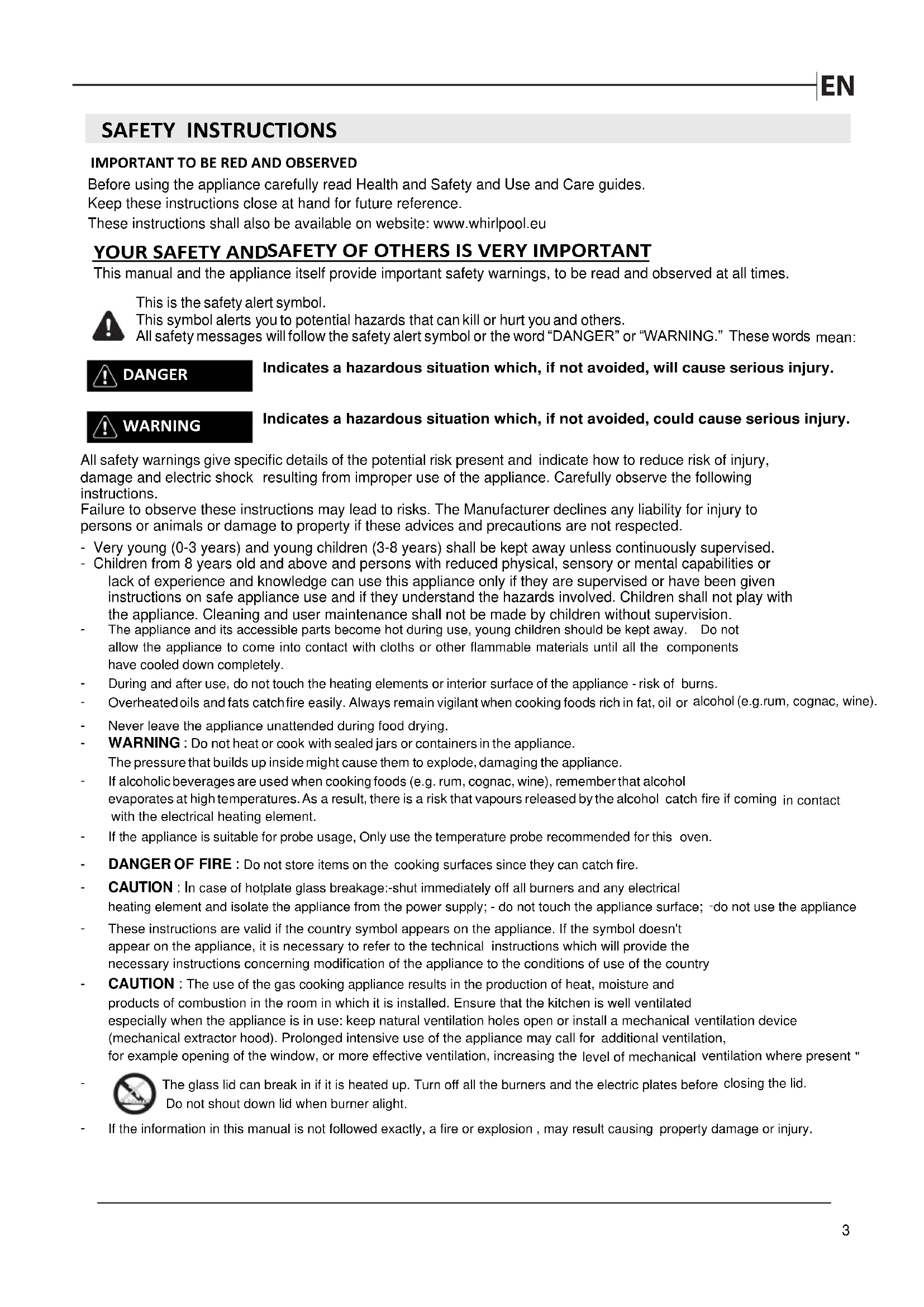 DANGER WARNING Before using the appliance carefully read Health and Safety and Use and Care guides.Keep these instructions close at hand for future reference. This is the safety alert symbol. This symbol alerts you to potential hazards that can kill or hurt you and others. All safety messages will follow the safety alert symbol or the word “DANGER” or “WARNING.” These words mean: All safety warnings give specific details of the potential risk present and indicate how to reduce risk of injury, damage and electric shock resulting from improper use of the appliance. Carefully observe the following instructions. - Very young (0-3 years) and young children (3-8 years) shall be kept away unless continuously supervised. - Children from 8 years old and above and persons with reduced physical, sensory or mental capabilities or lack of experience and knowledge can use this appliance only if they are supervised or have been given instructions on safe appliance use and if they understand the hazards involved. Children shall not play with the appliance. Cleaning and user maintenance shall not be made by children without supervision.