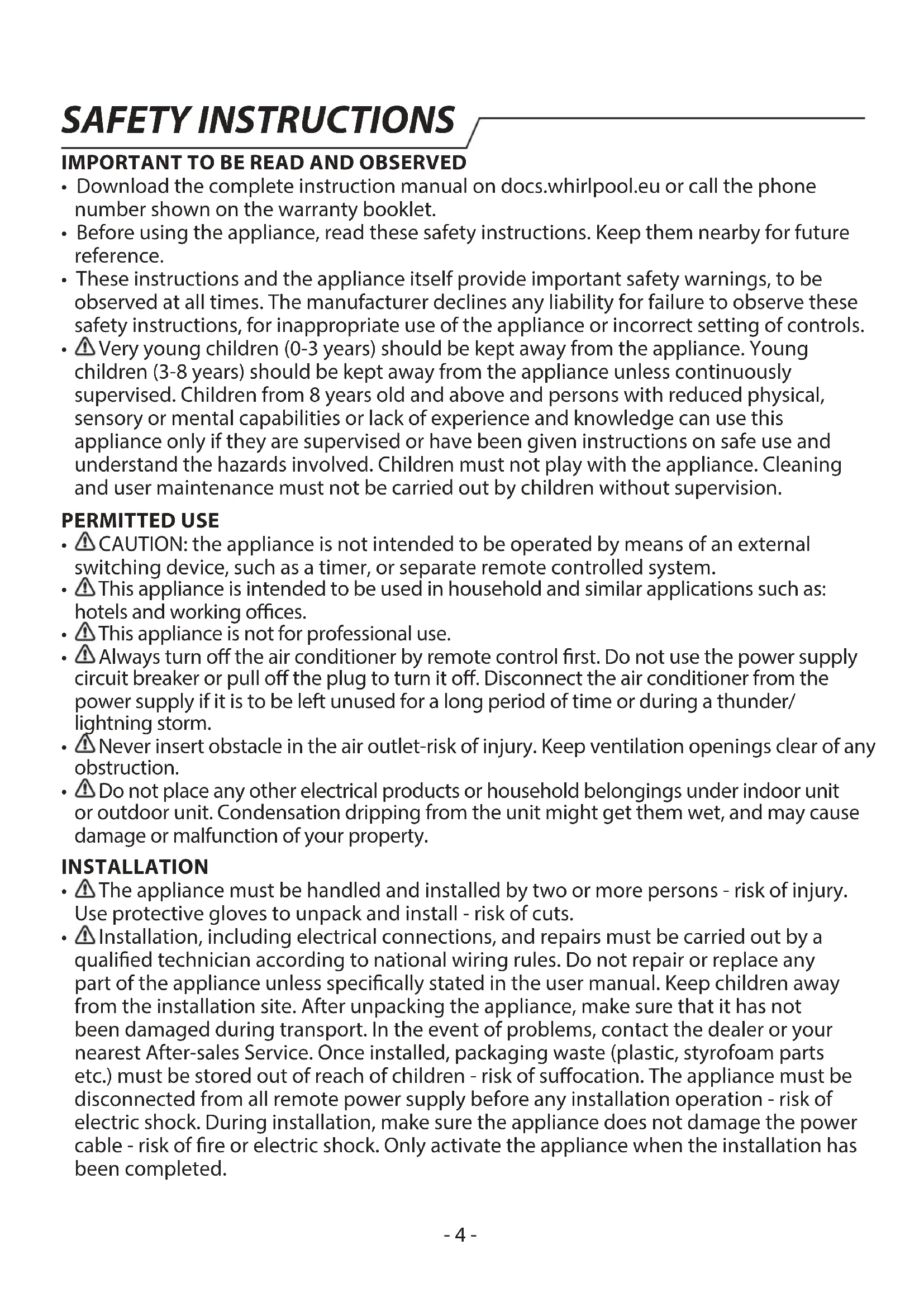 Installation, including electrical connections, and repairs must be carried out by a qualied technician according to national wiring rules. Do not repair or replace any part of the appliance unless specically stated in the user manual. Keep children away from the installation site. After unpacking the appliance, make sure that it has not been damaged during transport. In the event of problems, contact the dealer or your nearest After-sales Service. Once installed, packaging waste (plastic, styrofoam parts etc.) must be stored out of reach of children - risk of suocation. The appliance must be disconnected from all remote power supply before any installation operation - risk of electric shock. During installation, make sure the appliance does not damage the power cable - risk of re or electric shock. Only activate the appliance when the installation has been completed. SAFETY INSTRUCTIONS- 5 -