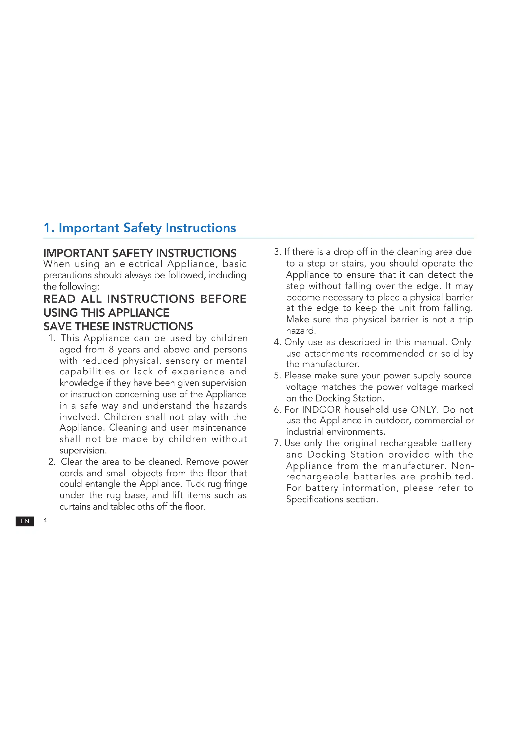 and Docking Station provided with the Appliance from the manufacturer. Non- rechargeable batteries are prohibited. For battery information, please refer to Specifications section.