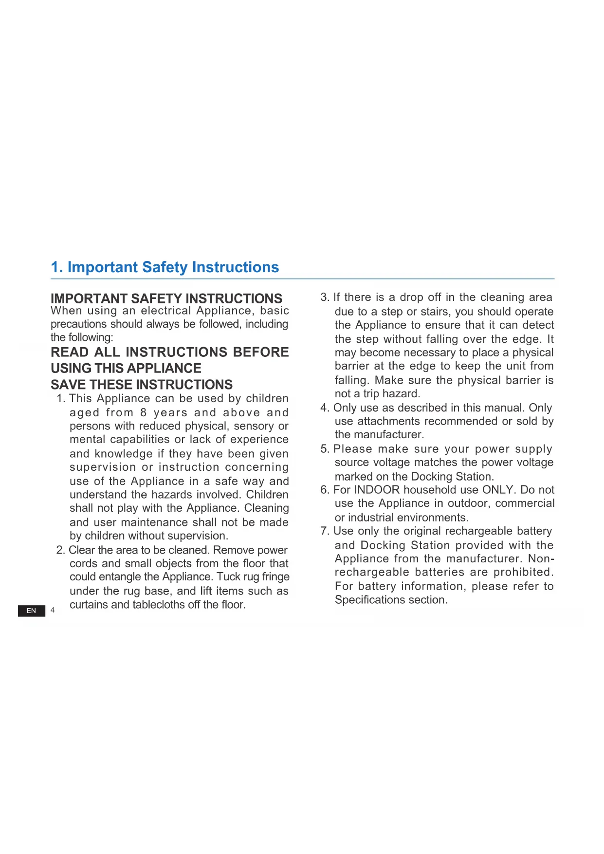 and Docking Station provided with the Appliance from the manufacturer. Non- rechargeable batteries are prohibited. For battery information, please refer to Specications section.