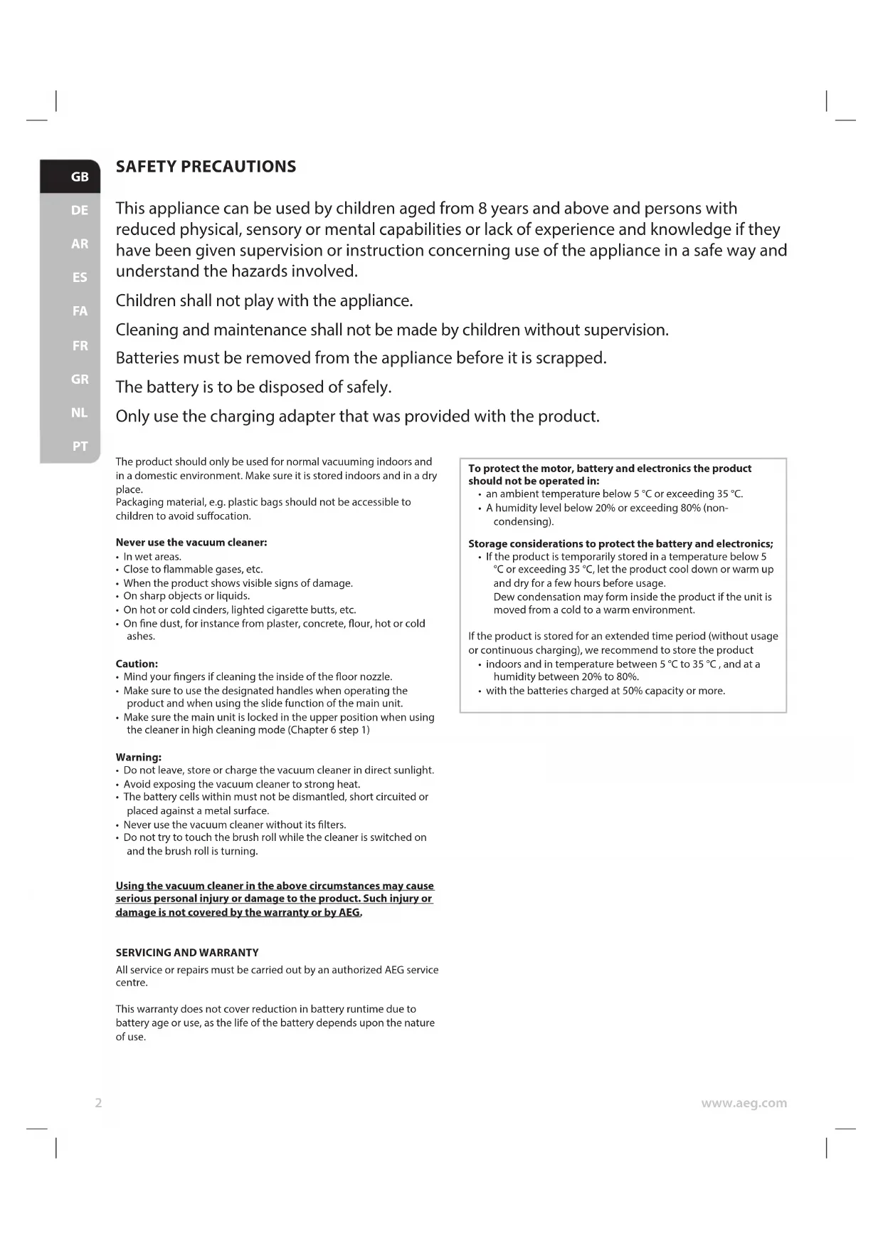 All service or repairs must be carried out by an authorized AEG service centre. This warranty does not cover reduction in battery runtime due to battery age or use, as the life of the battery depends upon the nature of use. SAFETY PRECAUTIONS This appliance can be used by children aged from 8 years and above and persons with reduced physical, sensory or mental capabilities or lack of experience and knowledge if they have been given supervision or instruction concerning use of the appliance in a safe way and understand the hazards involved. Children shall not play with the appliance. Cleaning and maintenance shall not be made by children without supervision. Batteries must be removed from the appliance before it is scrapped. The battery is to be disposed of safely. Only use the charging adapter that was provided with the product. To protect the motor, battery and electronics the product should not be operated in: