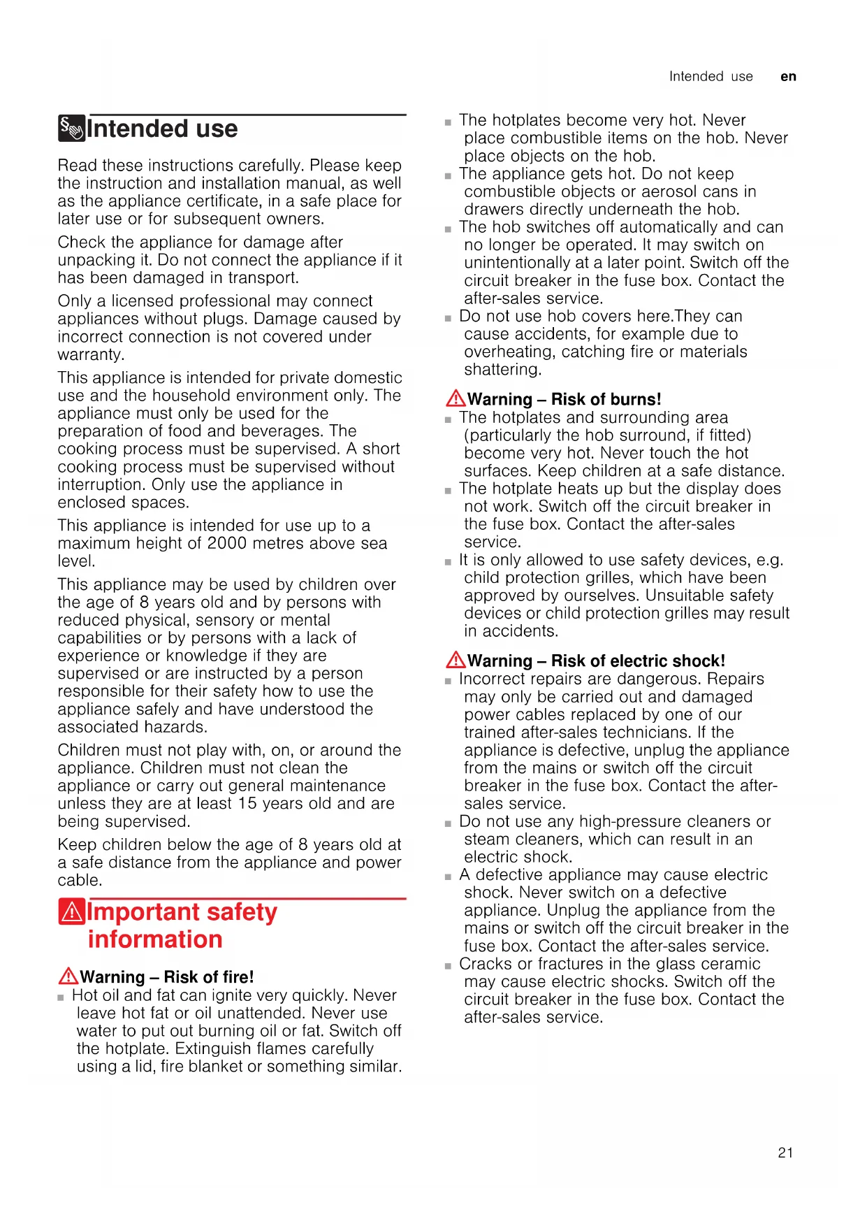 8Intended use Intended use Read these instructions carefully. Please keep the instruction and installation manual, as well as the appliance certificate, in a safe place for later use or for subsequent owners. Check the appliance for damage after unpacking it. Do not connect the appliance if it has been damaged in transport. Only a licensed professional may connect appliances without plugs. Damage caused by incorrect connection is not covered under warranty. This appliance is intended for private domestic use and the household environment only. The appliance must only be used for the preparation of food and beverages. The cooking process must be supervised. A short cooking process must be supervised without interruption. Only use the appliance in enclosed spaces. This appliance is intended for use up to a maximum height of 2000 metres above sea level. This appliance may be used by children over the age of 8 years old and by persons with reduced physical, sensory or mental capabilities or by persons with a lack of experience or knowledge if they are supervised or are instructed by a person responsible for their safety how to use the appliance safely and have understood the associated hazards. Children must not play with, on, or around the appliance. Children must not clean the appliance or carry out general maintenance unless they are at least 15 years old and are being supervised. Keep children below the age of 8 years old at a safe distance from the appliance and power cable. (Important safety information Important safety information :Warning – Risk of fire! ■ Hot oil and fat can ignite very quickly. Never leave hot fat or oil unattended. Never use water to put out burning oil or fat. Switch off the hotplate. Extinguish flames carefully using a lid, fire blanket or something similar. Risk of fire! ■ The hotplates become very hot. Never place combustible items on the hob. Never place objects on the hob. Risk of fire! ■ The appliance gets hot. Do not keep combustible objects or aerosol cans in drawers directly underneath the hob. Risk of fire! ■ The hob switches off automatically and can no longer be operated. It may switch on unintentionally at a later point. Switch off the circuit breaker in the fuse box. Contact the after-sales service. Risk of burns! ■ Do not use hob covers here.They can cause accidents, for example due to overheating, catching fire or materials shattering. :Warning – Risk of burns! ■ The hotplates and surrounding area (particularly the hob surround, if fitted) become very hot. Never touch the hot surfaces. Keep children at a safe distance. Risk of burns! ■ The hotplate heats up but the display does not work. Switch off the circuit breaker in the fuse box. Contact the after-sales service. Risk of burns! ■ It is only allowed to use safety devices, e.g. child protection grilles, which have been approved by ourselves. Unsuitable safety devices or child protection grilles may result in accidents. :Warning – Risk of electric shock! ■ Incorrect repairs are dangerous. Repairs may only be carried out and damaged power cables replaced by one of our trained after-sales technicians. If the appliance is defective, unplug the appliance from the mains or switch off the circuit breaker in the fuse box. Contact the after- sales service. Risk of electric shock! ■ Do not use any high-pressure cleaners or steam cleaners, which can result in an electric shock. Risk of electric shock! ■ A defective appliance may cause electric shock. Never switch on a defective appliance. Unplug the appliance from the mains or switch off the circuit breaker in the fuse box. Contact the after-sales service. Risk of electric shock! ■ Cracks or fractures in the glass ceramic may cause electric shocks. Switch off the circuit breaker in the fuse box. Contact the after-sales service.en Causes of damage