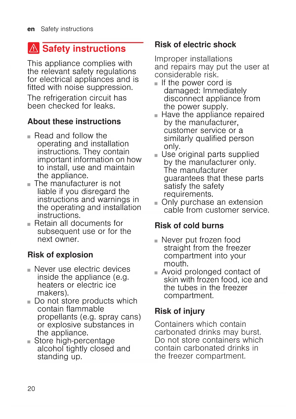 ( Safety instructions Safety instructions This appliance complies with the relevant safety regulations for electrical appliances and is fitted with noise suppression. The refrigeration circuit has been checked for leaks. About these instructions ■ Read and follow the operating and installation instructions. They contain important information on how to install, use and maintain the appliance. ■ The manufacturer is not liable if you disregard the instructions and warnings in the operating and installation instructions. ■ Retain all documents for subsequent use or for the next owner. Risk of explosion ■ Never use electric devices inside the appliance (e.g. heaters or electric ice makers). ■ Do not store products which contain flammable propellants (e.g. spray cans) or explosive substances in the appliance. ■ Store high-percentage alcohol tightly closed and standing up. Risk of electric shock Improper installations and repairs may put the user at considerable risk. ■ If the power cord is damaged: Immediately disconnect appliance from the power supply. ■ Have the appliance repaired by the manufacturer, customer service or a similarly qualified person only. ■ Use original parts supplied by the manufacturer only. The manufacturer guarantees that these parts satisfy the safety requirements. ■ Only purchase an extension cable from customer service. Risk of cold burns ■ Never put frozen food straight from the freezer compartment into your mouth. ■ Avoid prolonged contact of skin with frozen food, ice and the tubes in the freezer compartment. Risk of injury Containers which contain carbonated drinks may burst. Do not store containers which contain carbonated drinks in the freezer compartment.Safety instructions en