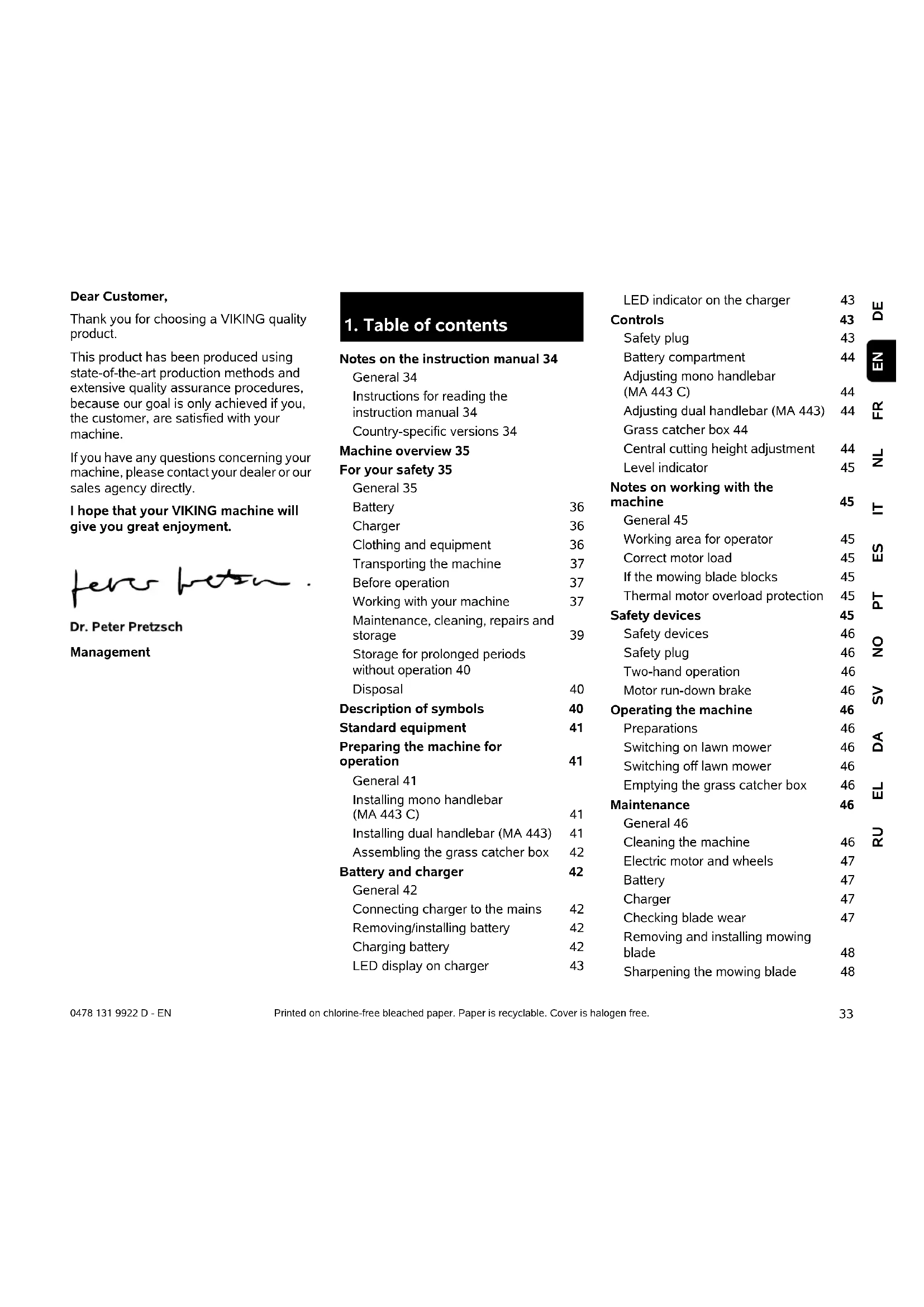 Notes on the instruction manual 34 General 34 Instructions for reading the instruction manual 34 Country-specific versions 34 Machine overview 35 For your safety 35 General 35 Battery 36 Charger 36 Clothing and equipment 36 Transporting the machine 37 Before operation 37 Working with your machine 37 Maintenance, cleaning, repairs and storage 39 Storage for prolonged periods without operation 40 Disposal 40 Description of symbols 40 Standard equipment 41 Preparing the machine for operation 41 General 41 Installing mono handlebar (MA 443 C) 41 Installing dual handlebar (MA 443) 41 Assembling the grass catcher box 42 Battery and charger 42 General 42 Connecting charger to the mains 42 Removing/installing battery 42 Charging battery 42 LED display on charger 43 LED indicator on the charger 43 Controls 43 Safety plug 43 Battery compartment 44 Adjusting mono handlebar (MA 443 C) 44 Adjusting dual handlebar (MA 443) 44 Grass catcher box 44 Central cutting height adjustment 44 Level indicator 45 Notes on working with the machine 45 General 45 Working area for operator 45 Correct motor load 45 If the mowing blade blocks 45 Thermal motor overload protection 45 Safety devices 45 Safety devices 46 Safety plug 46 Two-hand operation 46 Motor run-down brake 46 Operating the machine 46 Preparations 46 Switching on lawn mower 46 Switching off lawn mower 46 Emptying the grass catcher box 46 Maintenance 46 General 46 Cleaning the machine 46 Electric motor and wheels 47 Battery 47 Charger 47 Checking blade wear 47 Removing and installing mowing blade 48 Sharpening the mowing blade 480478 131 9922 D - EN