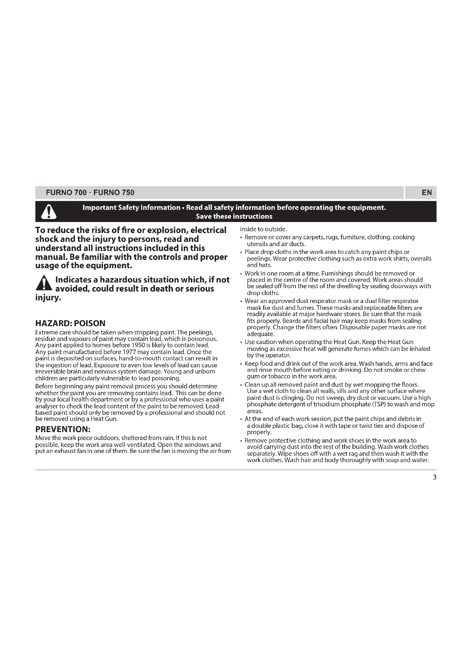 To reduce the risks of re or explosion, electrical shock and the injury to persons, read and understand all instructions included in this manual. Be familiar with the controls and proper usage of the equipment. Indicates a hazardous situation which, if not avoided, could result in death or serious injury. HAZARD: POISON Extreme care should be taken when stripping paint. The peelings, residue and vapours of paint may contain lead, which is poisonous. Any paint applied to homes before 1950 is likely to contain lead. Any paint manufactured before 1977 may contain lead. Once the paint is deposited on surfaces, hand-to-mouth contact can result in the ingestion of lead. Exposure to even low levels of lead can cause irreversible brain and nervous system damage. Young and unborn children are particularly vulnerable to lead poisoning. Before beginning any paint removal process you should determine whether the paint you are removing contains lead. This can be done by your local health department or by a professional who uses a paint analyser to check the lead content of the paint to be removed. Lead- based paint should only be removed by a professional and should not be removed using a Heat Gun. PREVENTION: Move the work piece outdoors, sheltered from rain. If this is not possible, keep the work area well-ventilated. Open the windows and put an exhaust fan in one of them. Be sure the fan is moving the air from inside to outside.